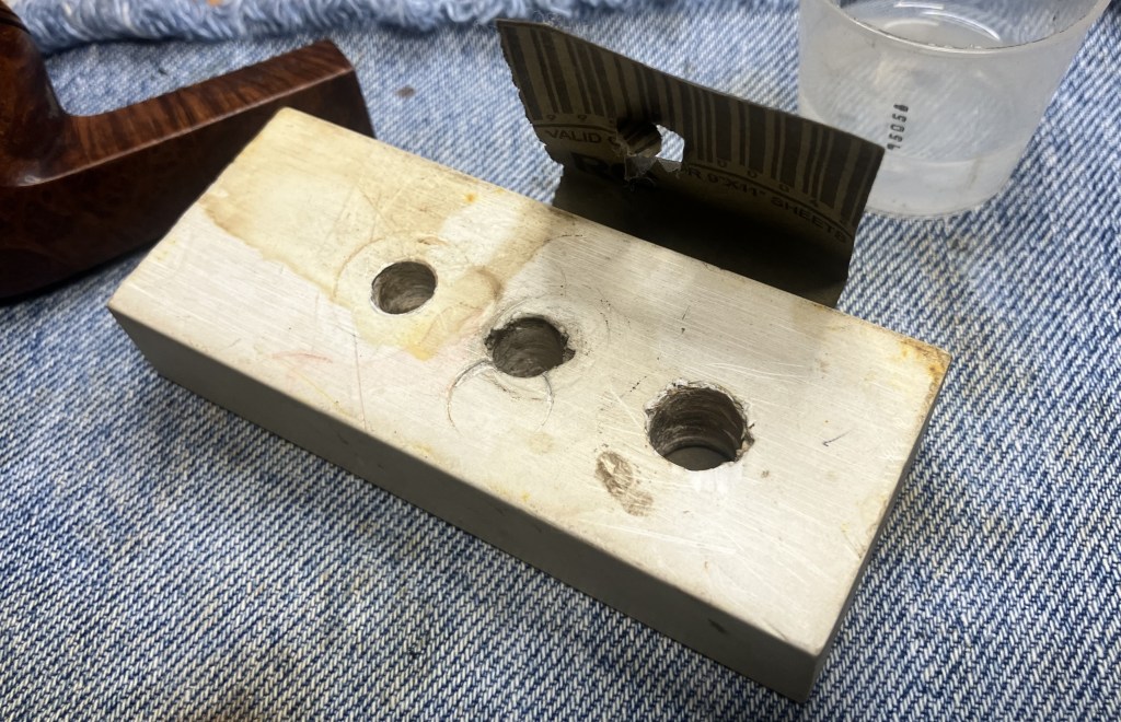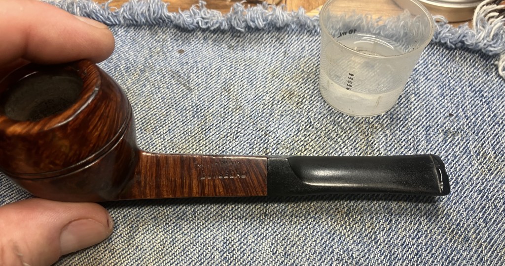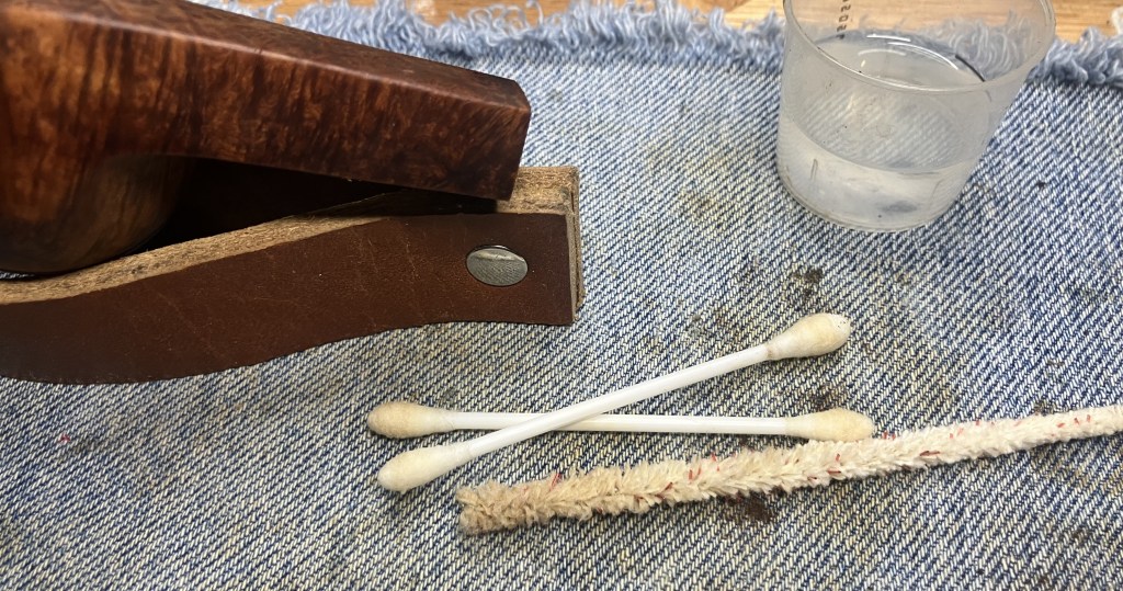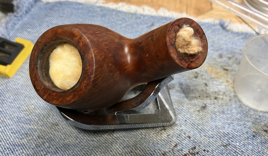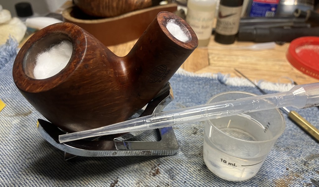 I couldn’t accept the cleanliness of the shank and thought it certainly must have been a fluke. I therefore decided to give the pipe a cotton-alcohol soak. The tobacco chamber and shank were stuffed with cotton and I prepared 10 ml of 99% ethyl.