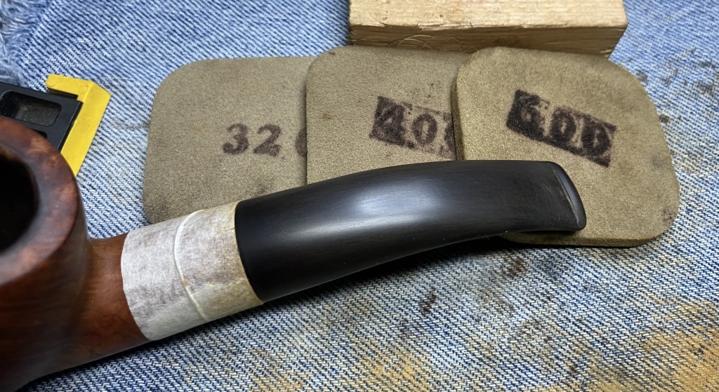 WIth the shank still masked I sanded the entire stem with a series of sanding sponges from 320-3500 grit. Between sponges I rubbed the stem with mineral oil and wiped it with a dry paper towel.