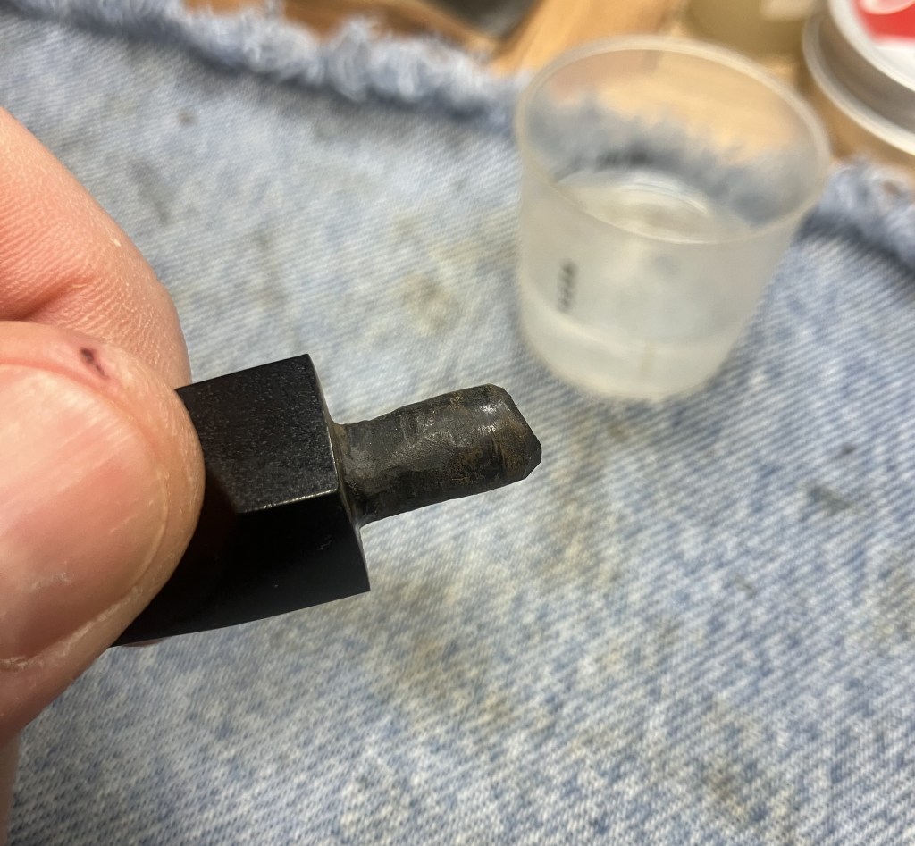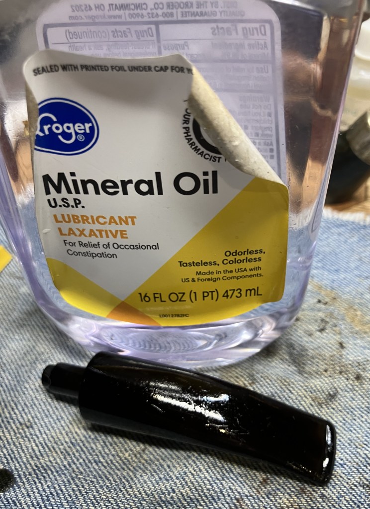 The shank went well using cotton swabs and bristle pipe cleaners dipped in ethyl alcohol. There was also a bit of scraping done with a dental scraper and boring of the airway with the Scotte stainless steel pipe reaming tool – shank drill.