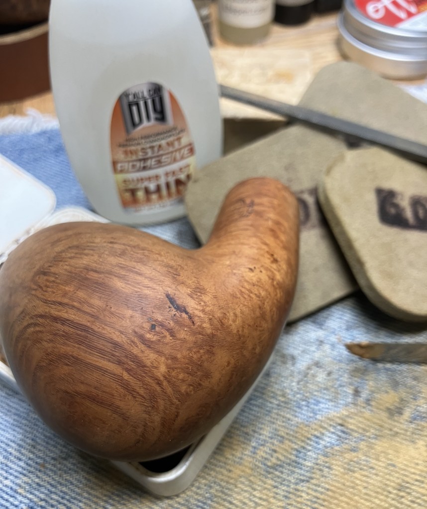 These pits were filled with briar dust pressed into the pit then a small drop of This cyanoacrylate (CA, superglue) was dabbed onto the briar dust. The CA soaked into the dust and bonds to the briar. This sets up nearly instantaneously. The rough surface was then filed smooth with a small flat file and additional briar dust was pressed into the remaining pit, with another dab of CA. I find that small layers work better than trying to fill large pits all at once.