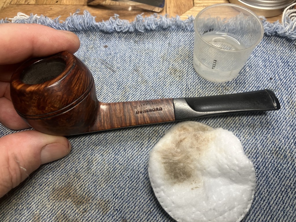 Back at the workbench the stummel was wiped with a make-up pad dipped in 99% ethyl alcohol. Some of the black dye came off. This was expected.