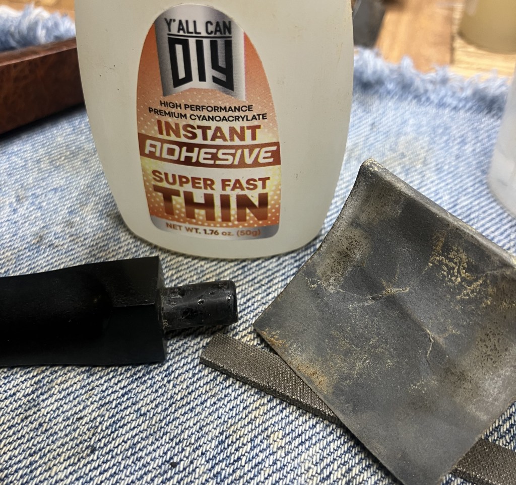 The tenon was restored to cylindrical shape by applying several light coats of Thin cyanoacrylate (CA, super glue). These were lightly filed and sanded between coats of CA.