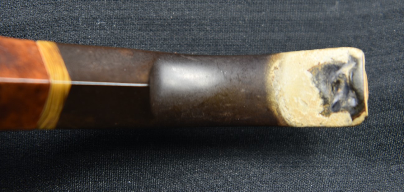 CA was then applied to the briar dust with the fly tying bodkin. THe CA soaked into the dust and set-up almost immediately. The result was sanded smooth with the contours of the stummel below. I then used a folded piece of 220 sandpaper to sand the groove. There is a better photo of the finished fill in the “finished” section at the end.