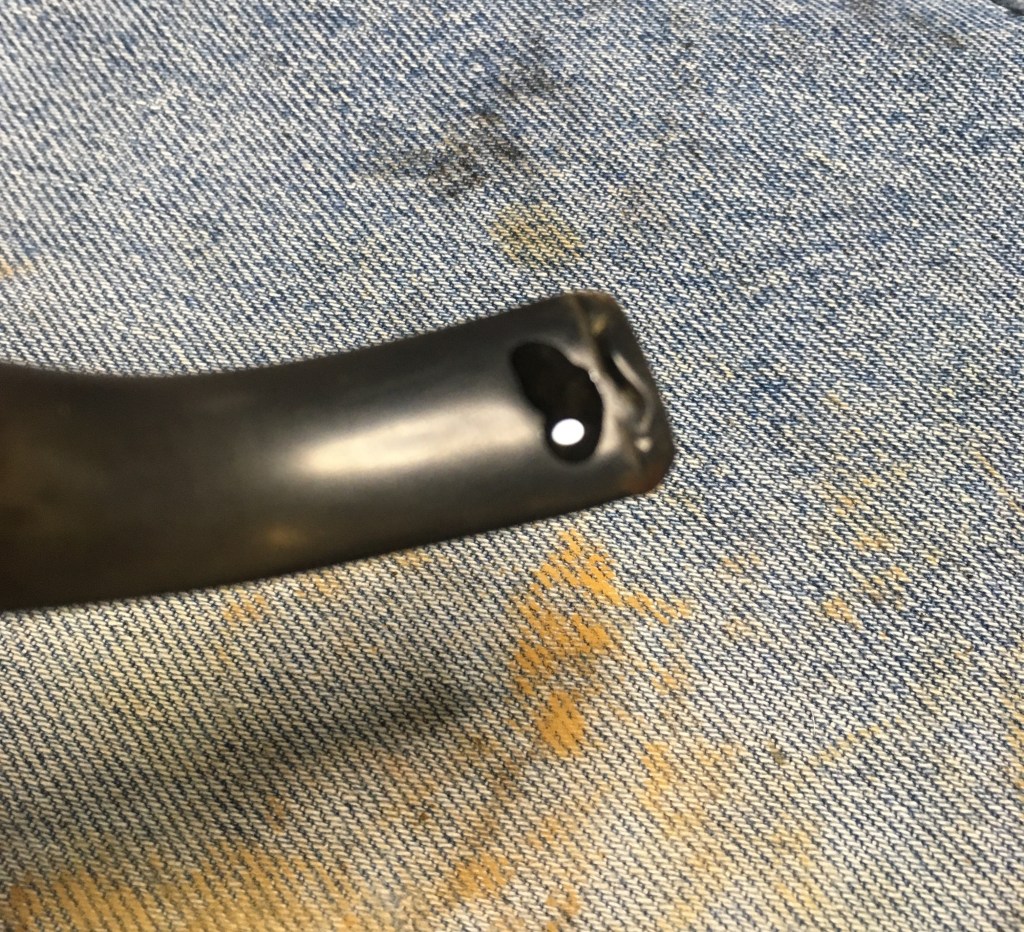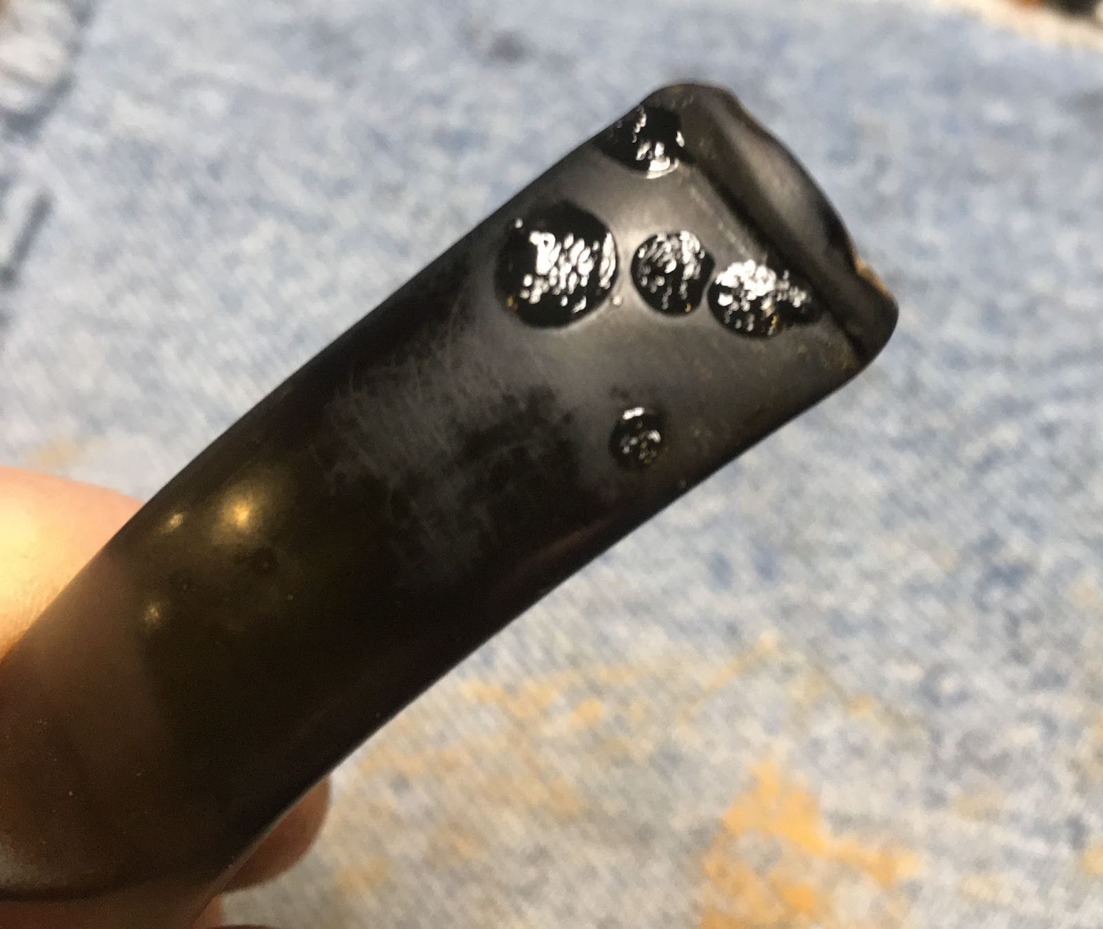 That brings me to step 6 – filling the dents and rebuilding the button. The dents were too deep to fill with a single application of black CA. Several smaller applications were used. Filing with a flat needle file and smoothing with a 400 sanding sponge were done between applications. Pardon the less than stellar photographs. Some day I’ll use the real camera rather than trying to do this one handed with a phone camera.
