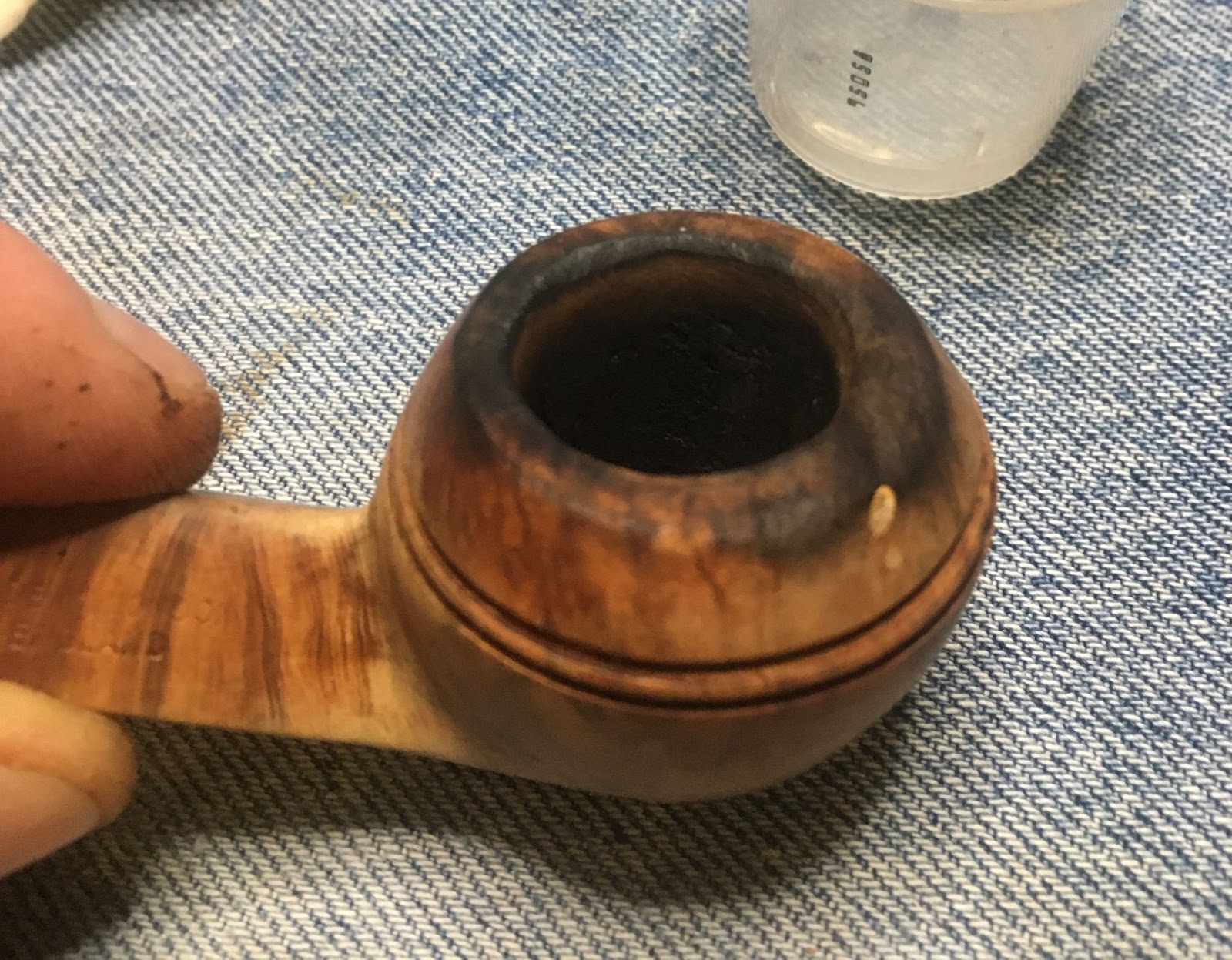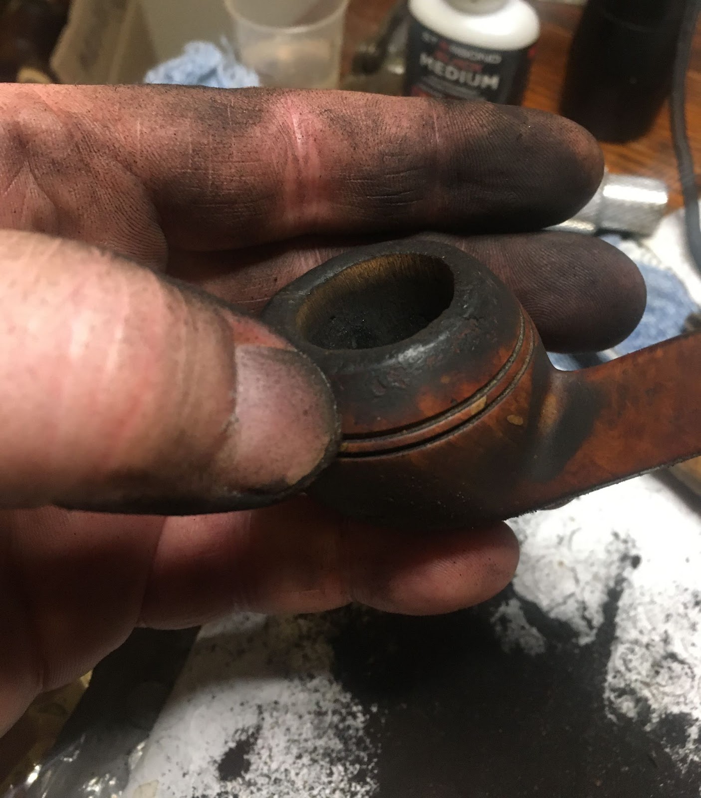 Just when I think the thing is about finished I notice something else that I just can’t ignore. OK, two things: The non-round tobacco chamber and the bottom of the chamber had a depression that was far below the draft hole. It looked like years of scraping had deepened the bowl. It is hard to see in the photos but you might be able to make it out.