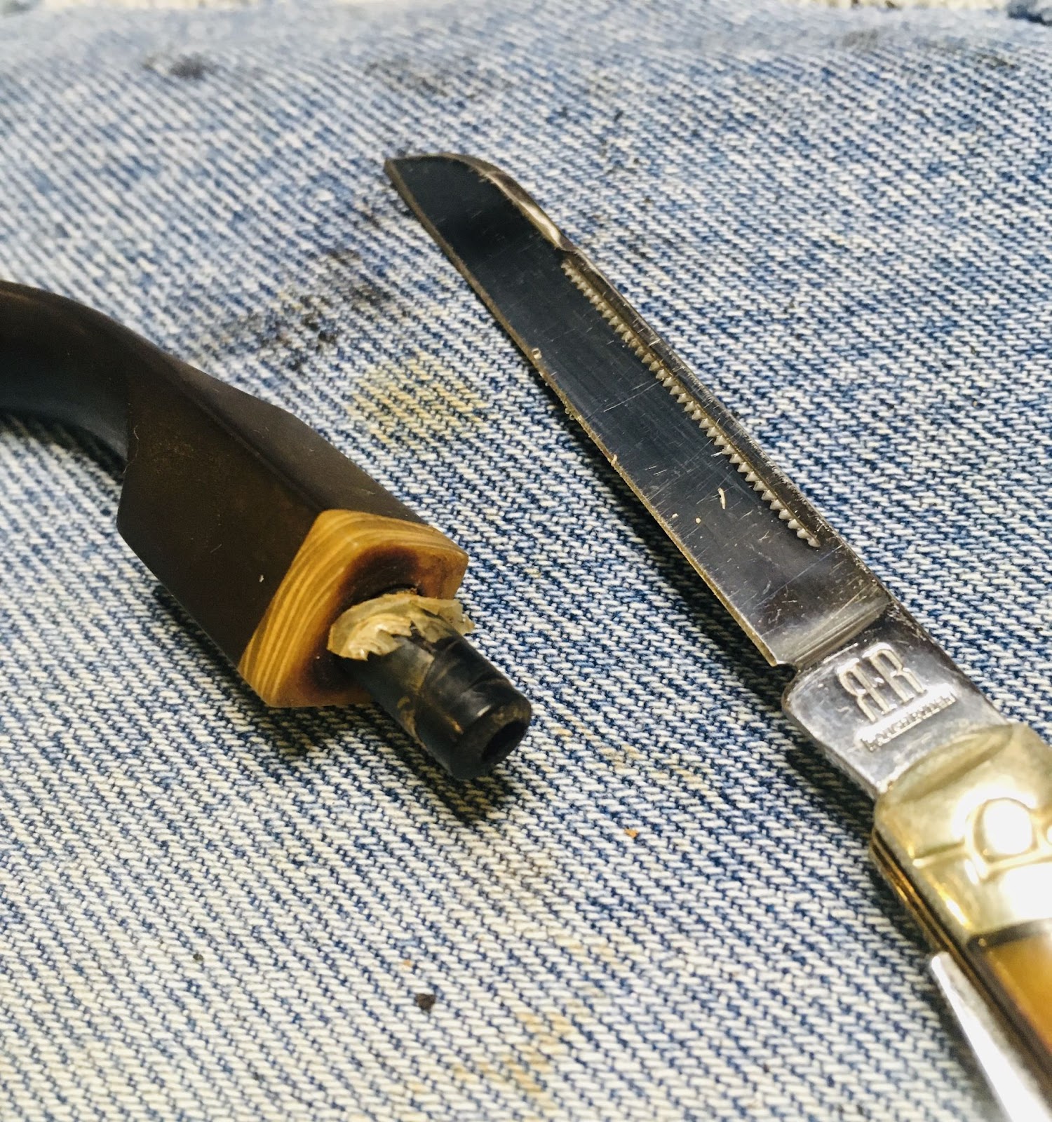 Following my incredible, well throughout, detailed, perfect plan I proceeded to step #1. Dramatic pause. The stem was too loose. I had forgotten that when I was initially assessing this restoration I noticed that the tenon had what appeared to be beeswax, or something like it, spread on the tenon. I had scraped this off. I photographed it too and completely forgot about it.