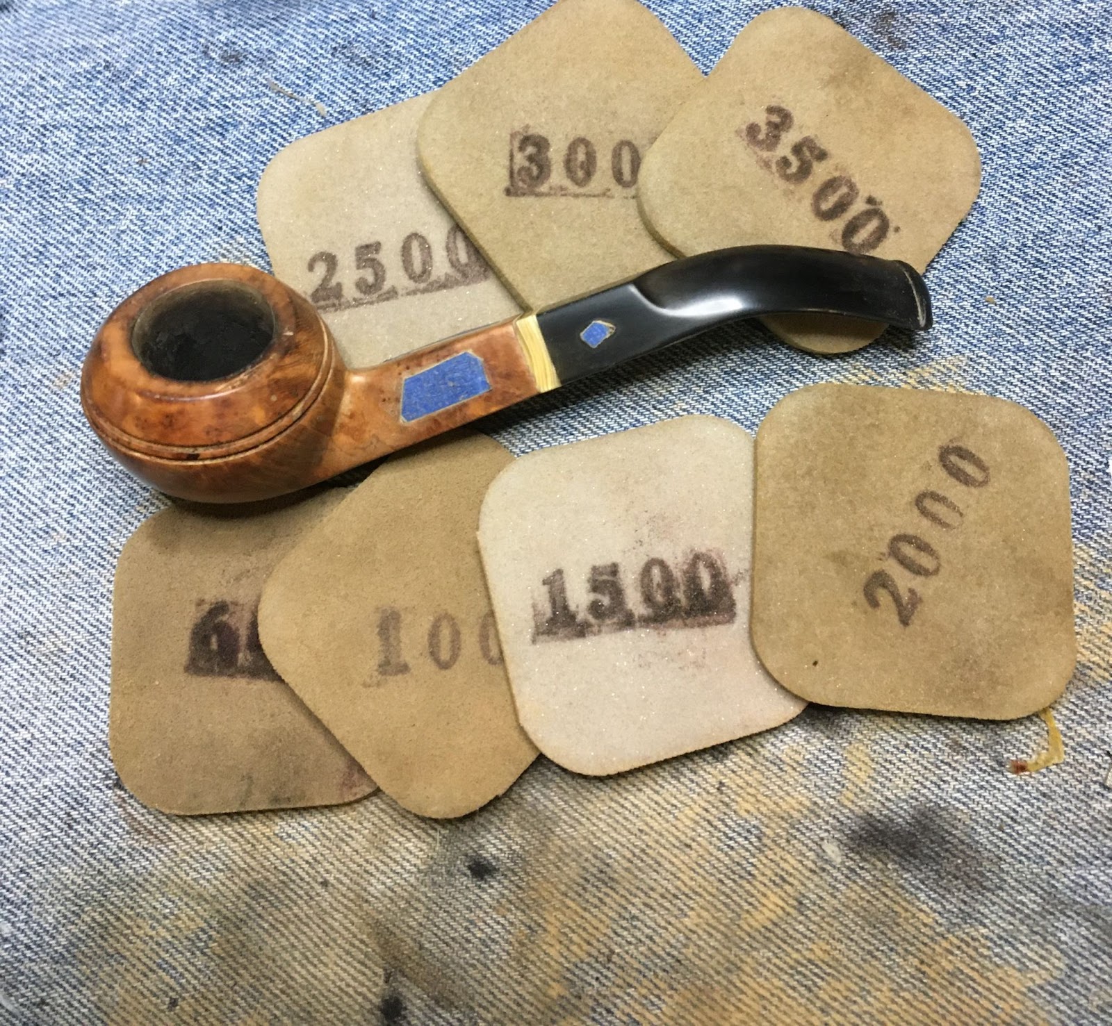 That brings us to the last two steps of the incredible, well throughout, detailed, perfect plan. The taping of the logo and the sanding and micro-meshing of the pipe. The sanding went smoothly, no pun intended. The sanding sponges were used in sequence from the 600-3500. Between spongers I would wipe the stummel with an alcohol wetted make-up pad. The stem was wiped off with a dry paper towel and every couple of sponges I would apply a coating of mineral oil and wipe that off before going to the next sponge.