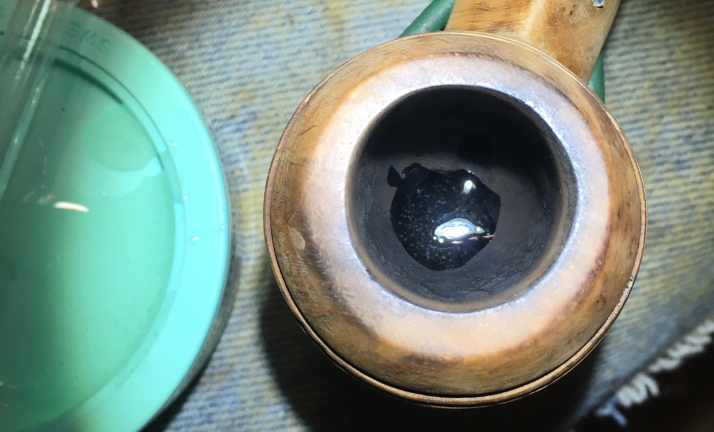 The make-up pads finally stopped discoloring. The next step was to clean the airway within the shank. As usual I neglected to photograph this process. I can describe it though. I poured about 3 ml of 95% ethyl alcohol into the bowl. A nylon shank brush was then used to scrub the airway while keeping the stummel held at an angle allowing the alcohol in the chamber to dissolve the tars and keep the brush wet. I then poured the alcohol into a medicine cup and swabbed out the loosened residue with cotton swabs. This was repeated until the cotton swab emerged clean. In this case it was repeated many times.
