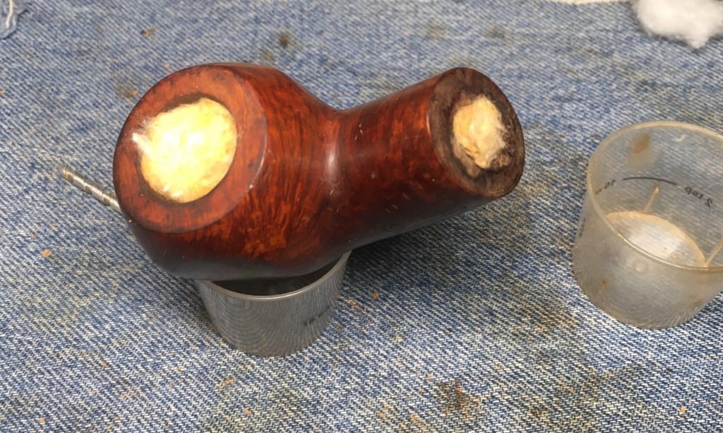 I thought that a cotton alcohol treatment would do this pipe a world of good. I packed the tobacco chamber and the airway with cotton.