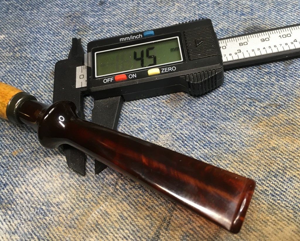 I examined the stem then measured it with a caliper. It was 5.1 mm thick. I recalled reading once that Dunhil stems were regarded by many to be the most comfortable stems and that they were close to 4 mm thick. That would mean that I needed to take 0.5 mm from the top and 0.5 mm from the bottom of this new stem. Hmm, do I dare file this beauty and risk marring the gorgeous finish. Oh yes, I dare.