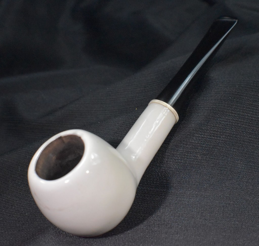 I compared my other example of a porcelain pipe to this pipe. I was struck by the color difference. My bent pipe has been smoked numerous times and it has taken on a very nice creamed coffee color. It was originally a bright white as well. The apple had obviously been smoked but had not experienced the same coloring.