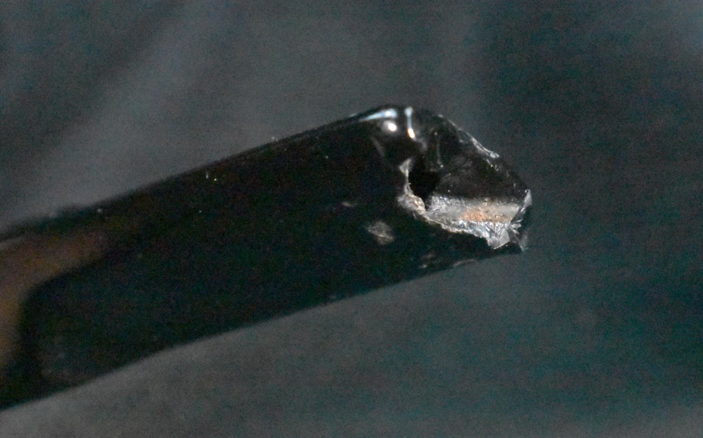 I sent my preliminary findings and photos to the client, Cash. I wanted his opinion regarding this as a possible repair solution. He consented to the application of melted acrylic. More pressure but at the same time I thought I was onto a very workable solution to the problem at hand. One thing I had ordered since I started this project was a couple of ½ inch rods of black acrylic. I thought that the rods might be useful as a source of acrylic welding material where I did not have to deal with the problems with the turnings, aka, air bubbles within the weld.