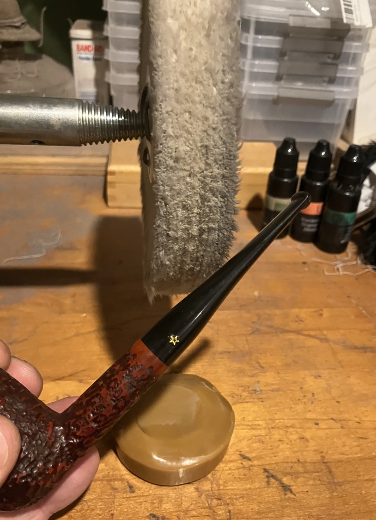 The stem then received several coats of carnauba wax at the buffer. The stummel also was waxed with carnauba but very lightly as I did not want to fill the rustications with wax deposits.