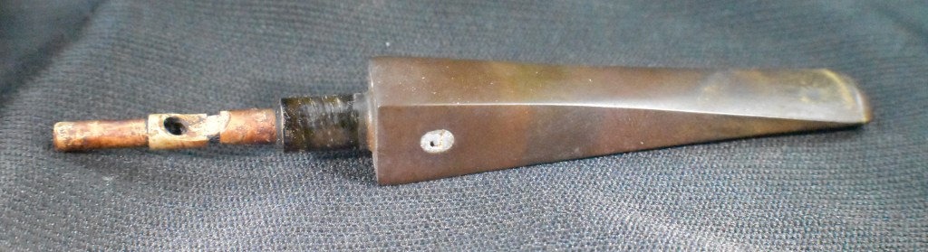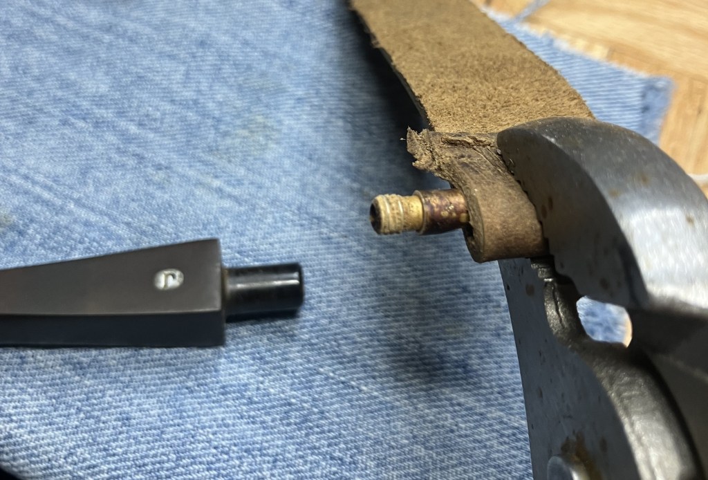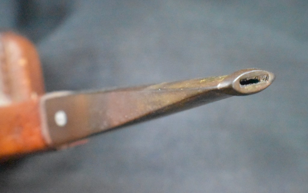 The stem was a tight fit and not wanting to force things unnecessarily, I began work on the stem. The stinger was fouled with smoking residue and quite stuck in the stem. I used a strip of thick leather to protect the aluminum of the stinger from the jaws of the pliers.