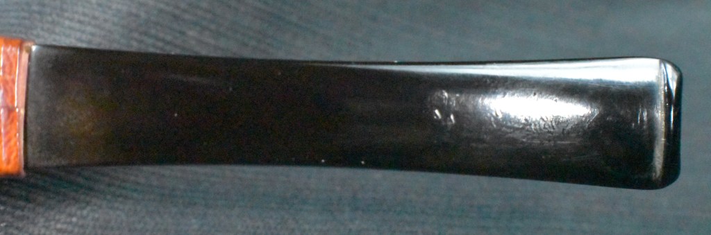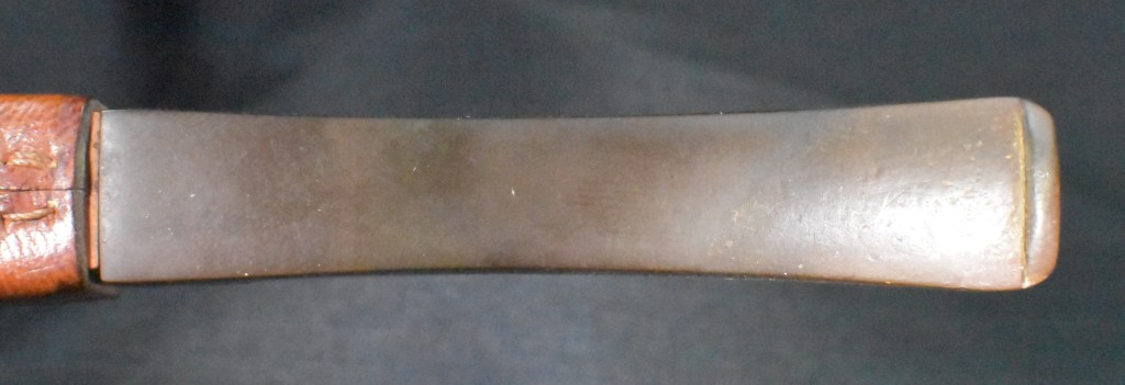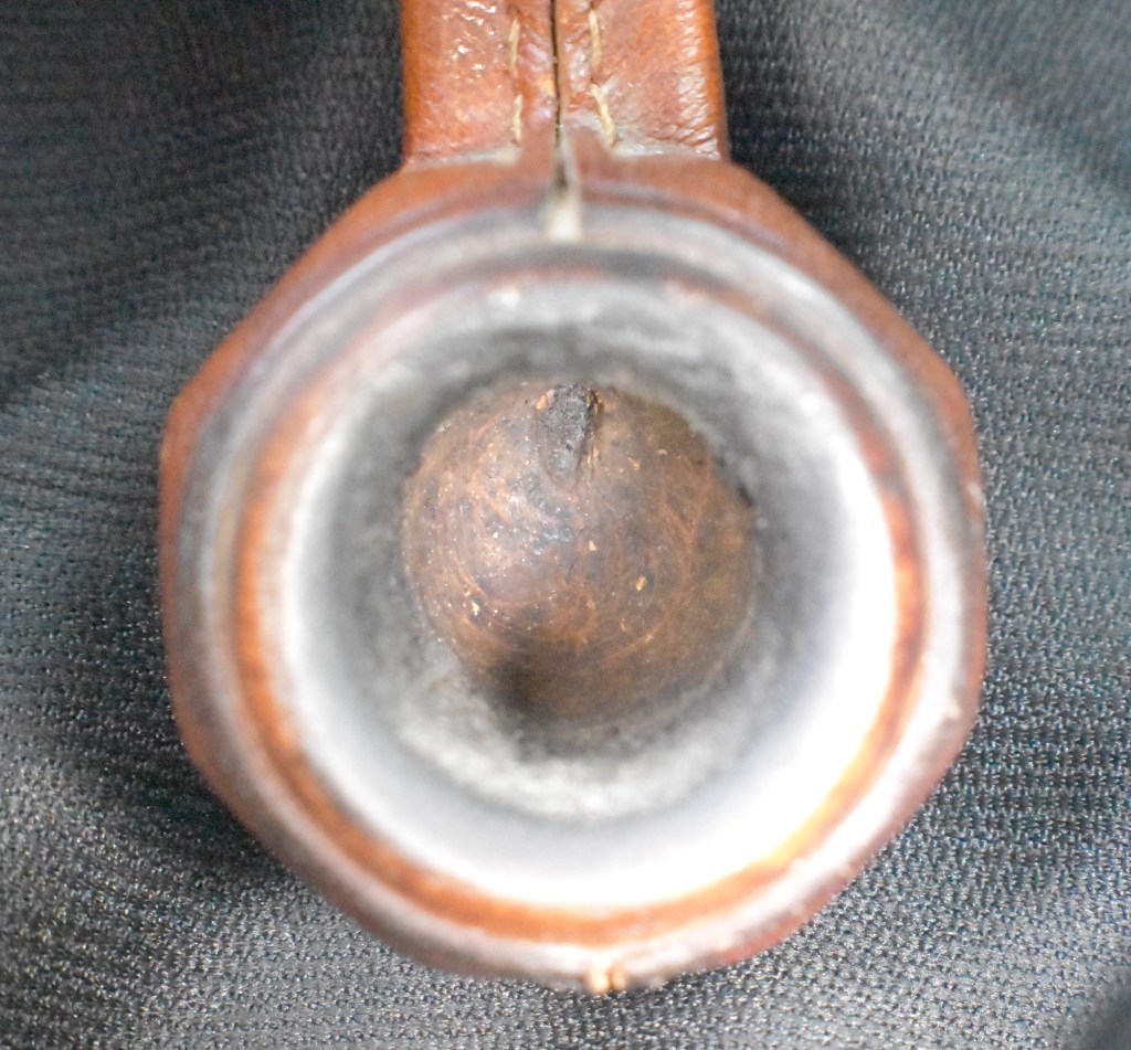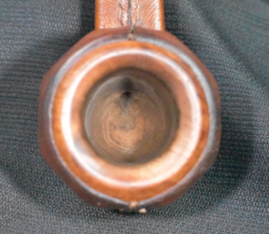 The stem showed signs of oxidation and tooth chatter. The stem’s stinger was well lacquered with smoking residue indicating frequent use. The tobacco chamber had a bit of cake and the rim was lava encrusted. The seams of the leather looked good and intact and the condition of the leather, overall, was good. There was some discoloring of the edges of the leather around the rim which I thought would be difficult at best to remove. Overall though the pipe looked like it had great potential.