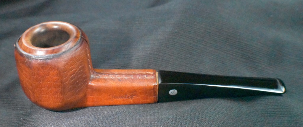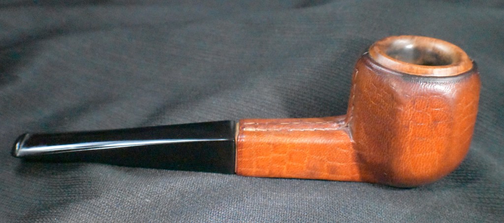I kind of think who ever came up with leather clad pipes either had some structurally sound but ugly briar blocks or they were hallucinating due to taking Ambien and took a break from walking their frozen turkey while wearing a tangerine Speedo and a sombrero long enough to wrap a piece of briar in leather. Yeah, let that vivid mental image marinate before continuing. Either way, they do show up on the estate market and can be pretty pipes. This Jeantet with a faux alligator-skin texture for example is a pretty pipe. Once again, I can’t recall how it came to me other than as part of an estate lot. Below are some photos of the pipe before work began.
