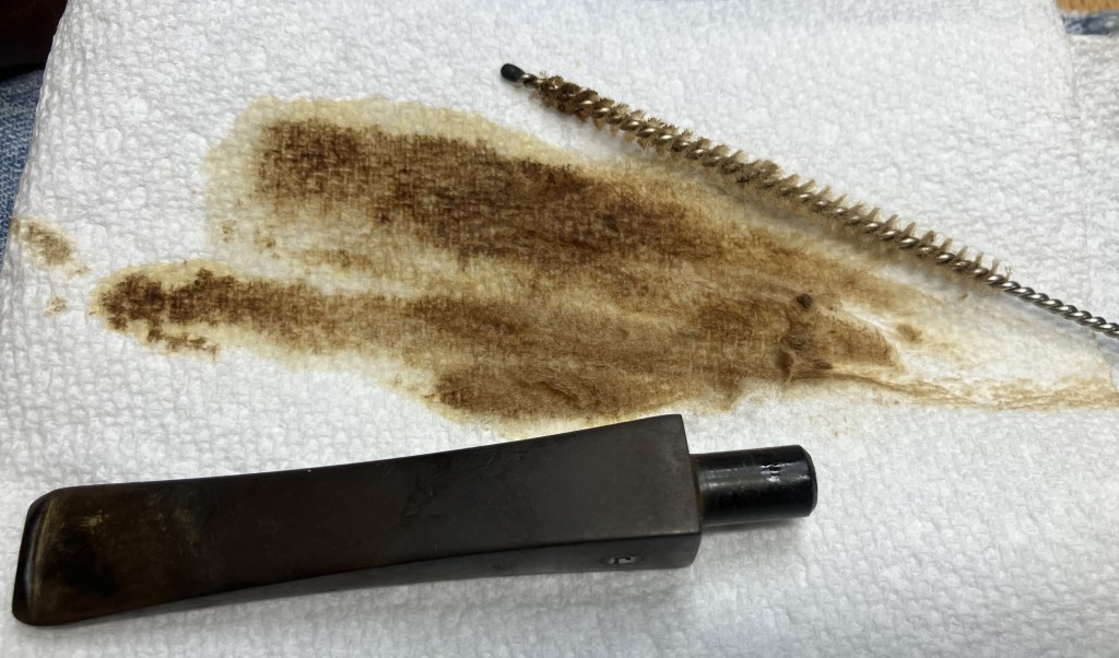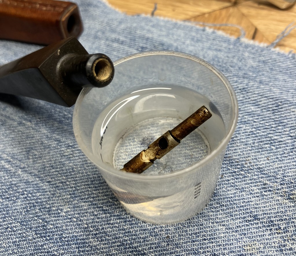 I dropped the stinger into a medicine cup of 99% ethyl alcohol to soften the residue and proceeded to clean the vulcanite threads of the stem.