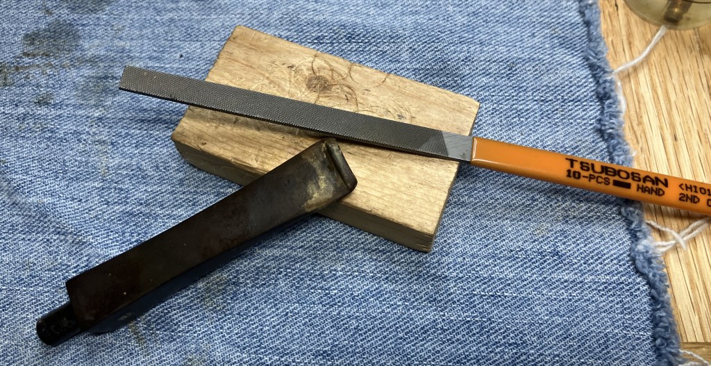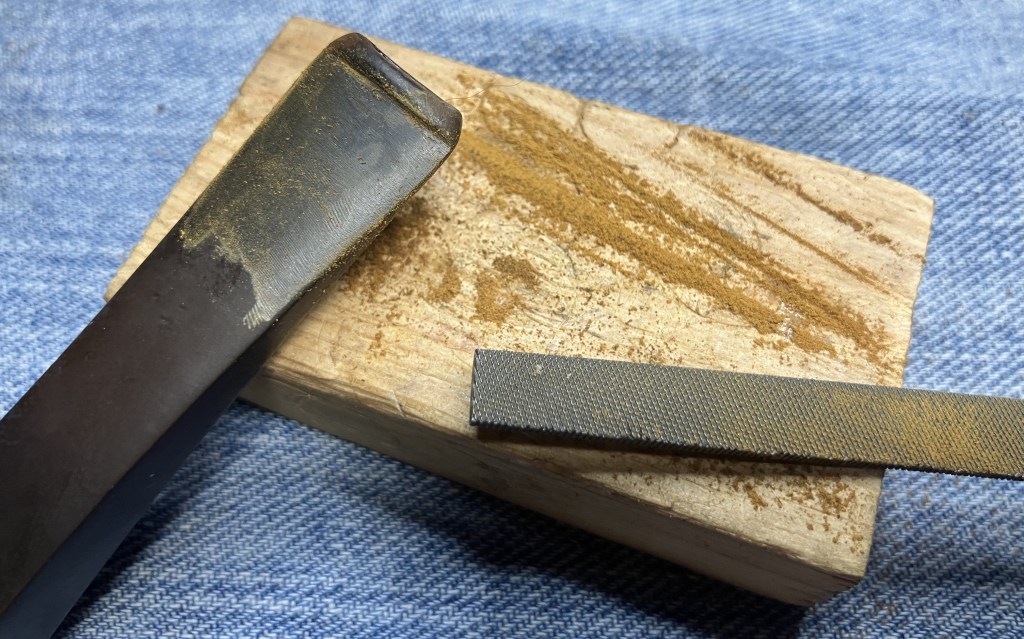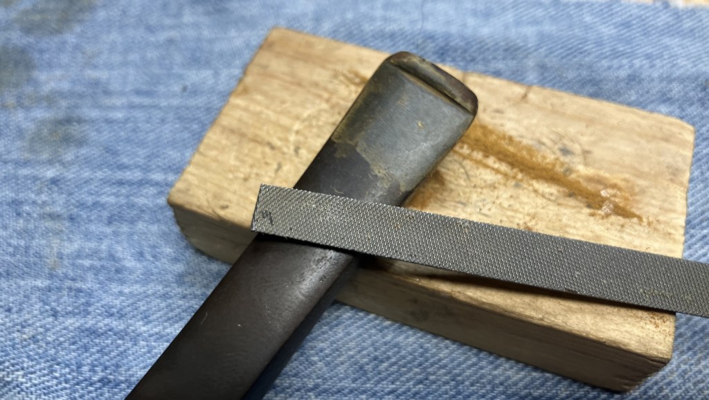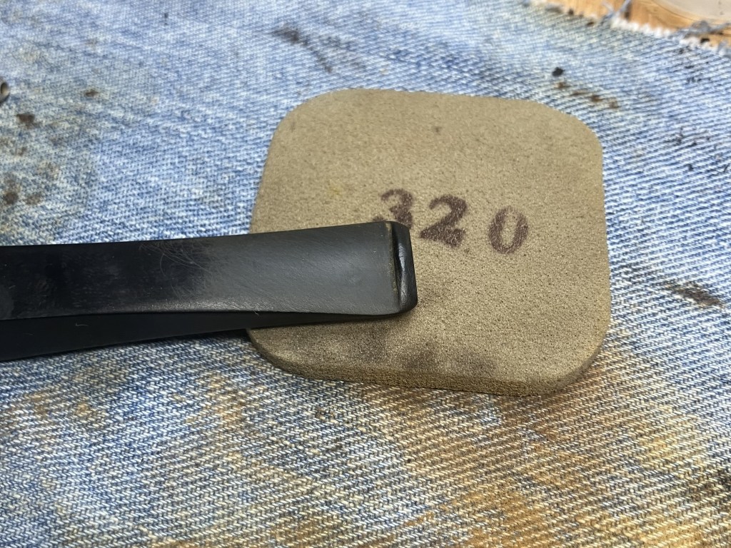 I wanted to keep the squared shape as much as possible. To do this I used a piece of 400 grit sandpaper wrapped around a wooded block. This was in an attempt to keep the square shank preserved as much as possible.