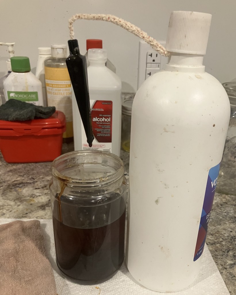 I was pretty sure there was still a good deal of yuck in the airway so a cotton/alcohol treatment was prescribed. The bowl and airway were packed with cotton and 12 ml of 99% ethyl alcohol measured into a medicine cup.