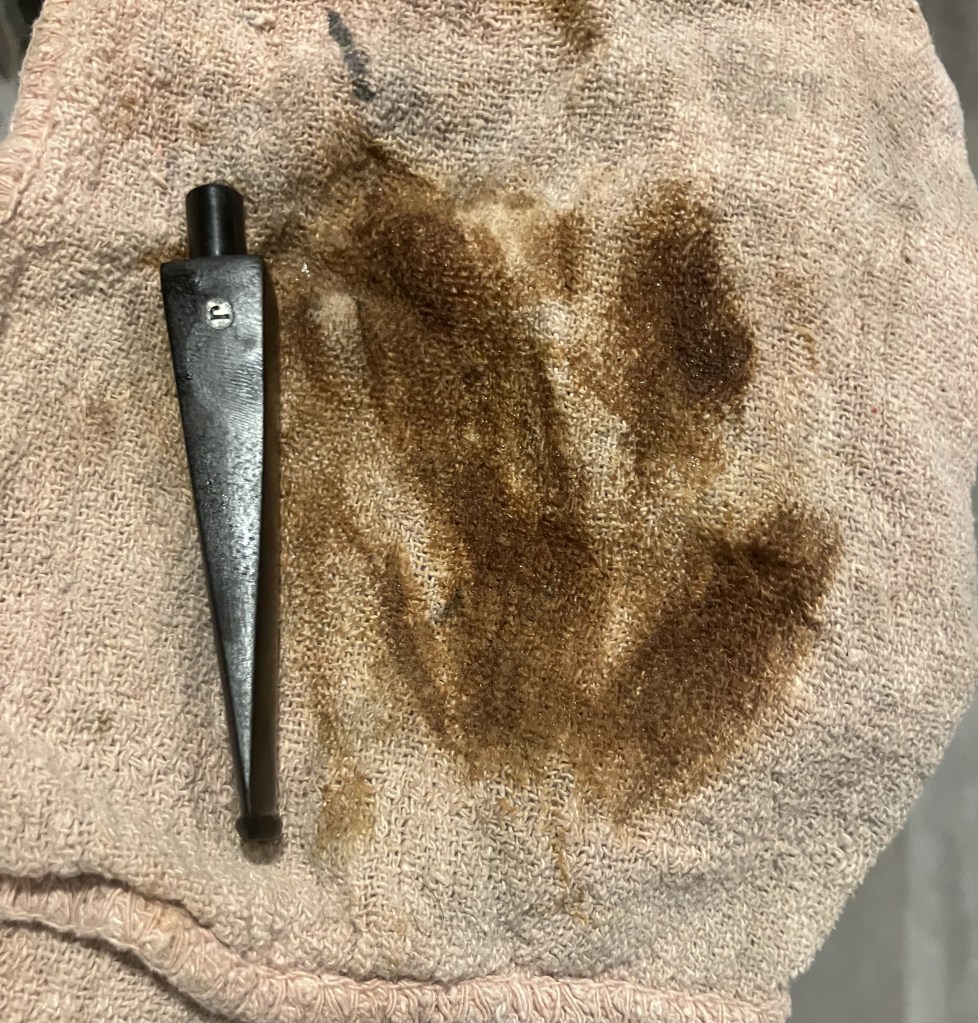 A coarse shop rag was used to vigorously rub the stem to remove the loosened oxidized vulcanite and to absorb the solution. You can see from the stains on the rag how effective this was.