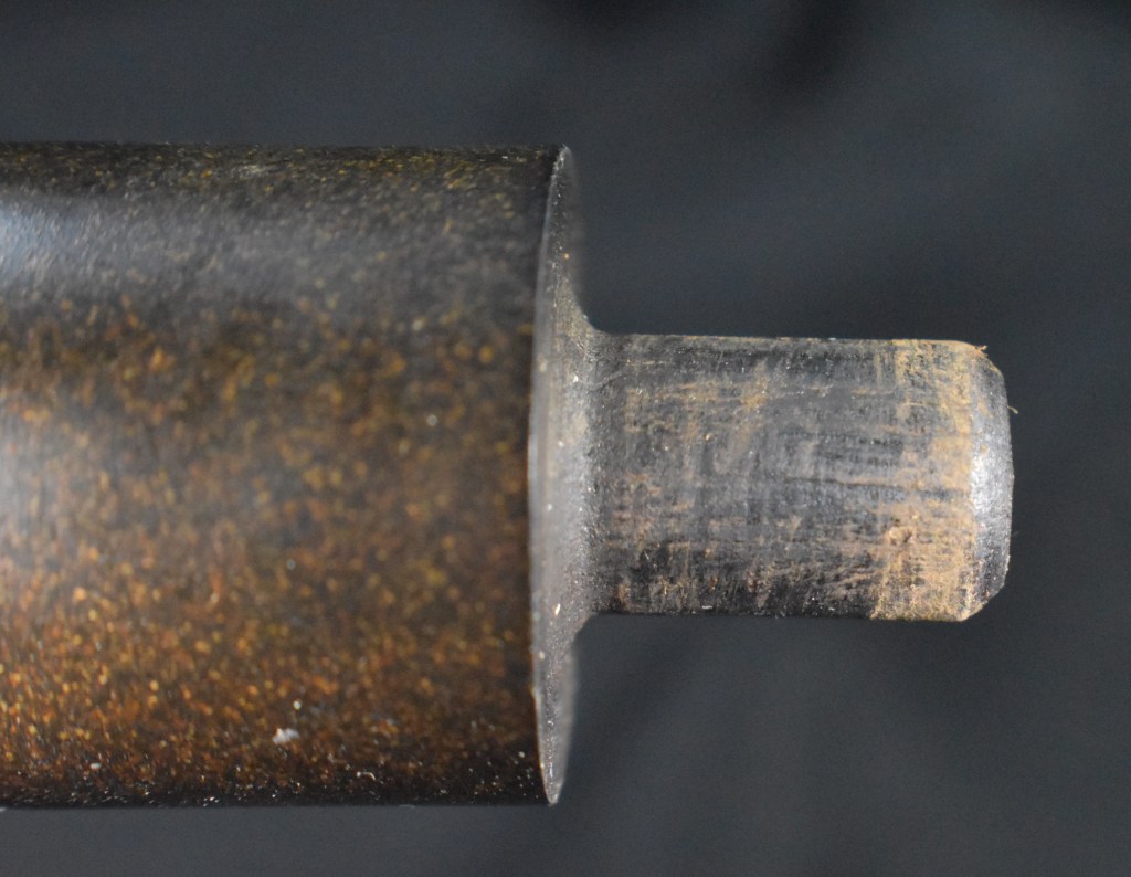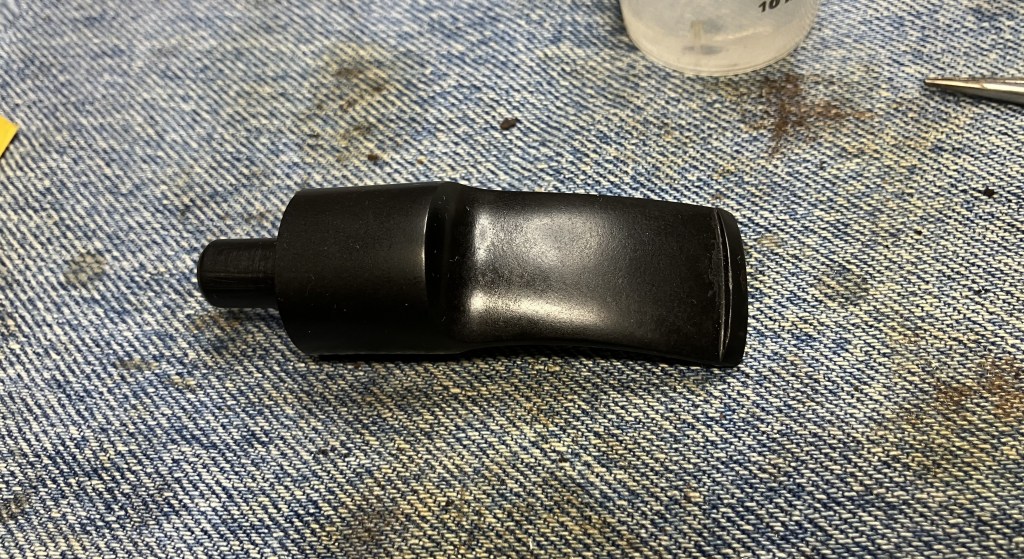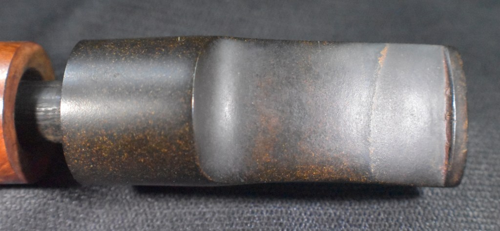 Back at the workbench the stem was rubbed with mineral oil on the outside and in the airway.  The color had returned to mostly black but the surface was rough and pitted.