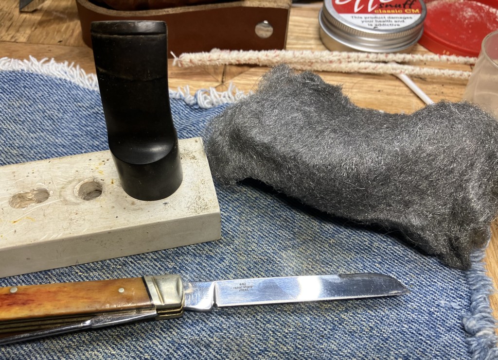 The first task was to prep the stem for deox, a term used to describe the bath in Before and After Extra Strength Deoxidizer.  I used a wood block to preserve the edge of the stem from rounding from working it with 0000 steel wool.  The pocket knife in the photo below was used to scrape some of the calcium despots from the button area.