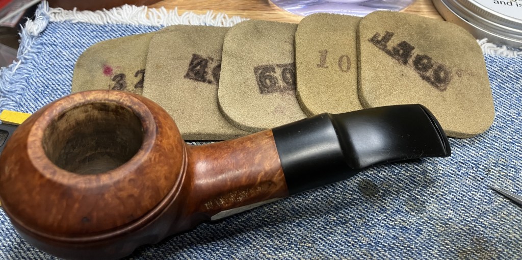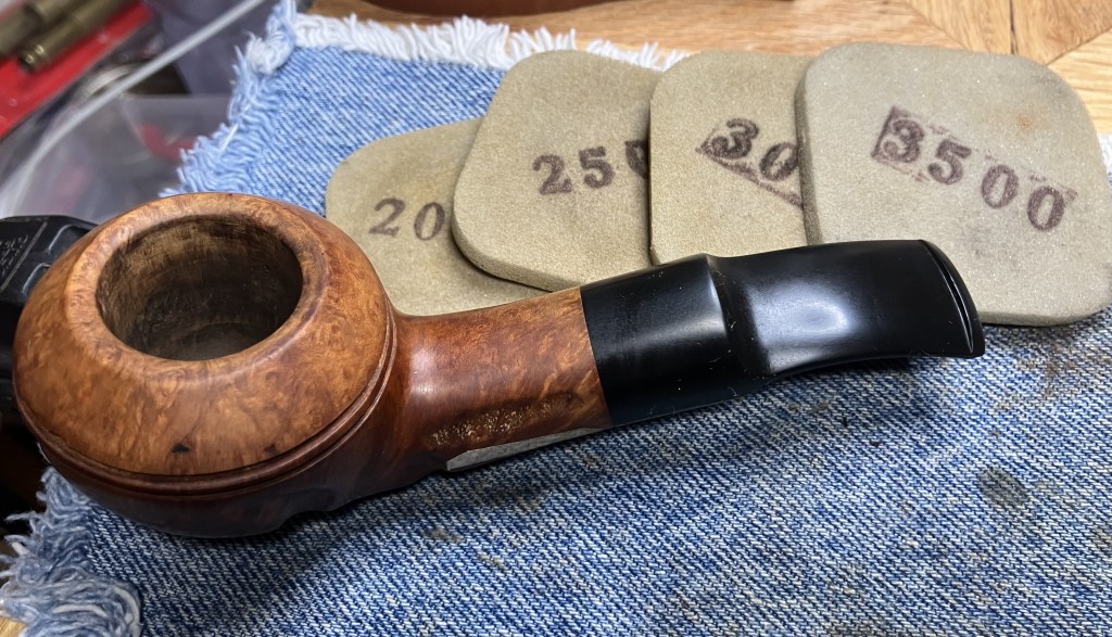 The stem and shank were sanded together using a series of sanding sponges in grits from 320-1500.  Between sponges the stem was rubbed with mineral oil and the shank wiped with an alcohol wetted make-up pad.