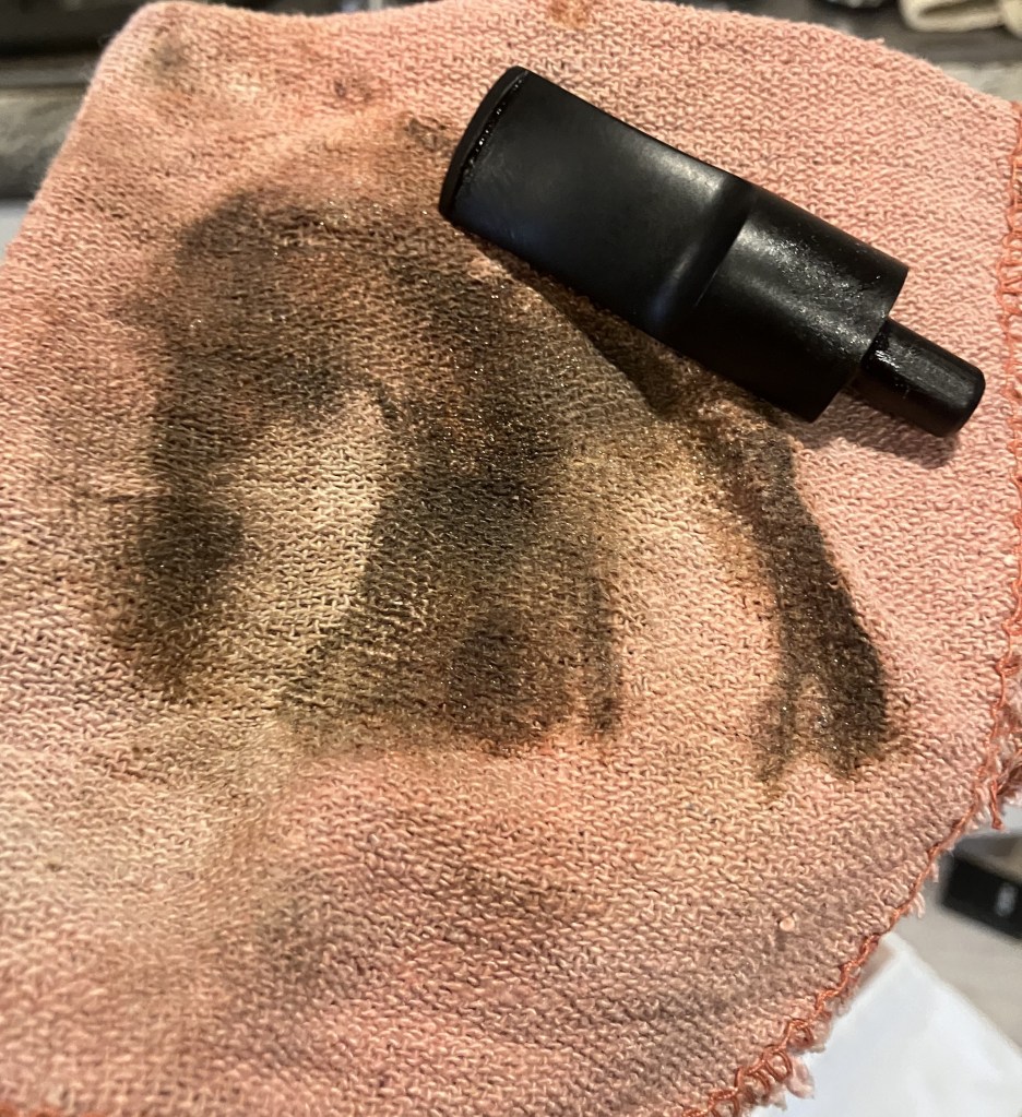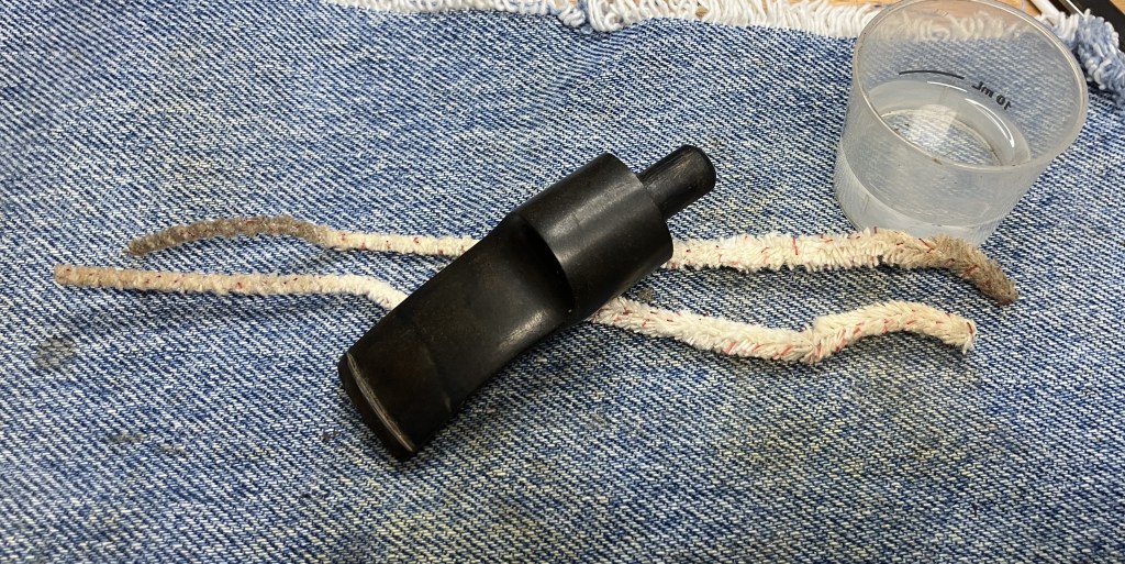 The stem was then vigorously rubbed with a coarse cotton shop rag.  This removed a lot of oxidized rubber that had been softened by the deox.
