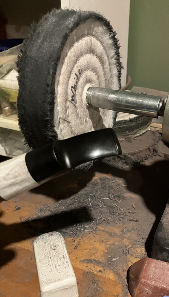 I wrapped the shank with masking tape then took the pipe to the buffer and polished the stem with white buffing compound on the dedicated white compound wheel.