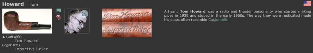 “Tom Howard was a popular comedian and personality in the 1940s/50s, known for vaudeville stage and radio work. But he also was a skilled pipe maker. In a Popular Mechanic article from 1947 he is written up as the “Hobbyist of the Month, Tom Howard.” He made pipes in his workshop outside his home in Red Bank, NJ. starting about 1939, and looks like into the late 1940’s or later. He purchased briar blocks by the bag as well as stem blanks, and in his well equipped shop he hand crafted his pipes, in about three hours on average. He was a true craftsman, also specializing in intricate model boats, trains and brass cannons, all built to scale.” (Howard – Pipedia)