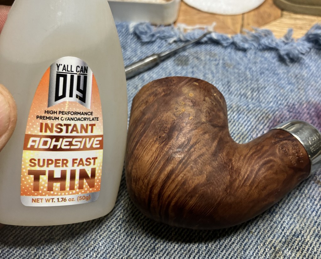 The new fill would be made of Briar dust pressed into the pits then topped with thin cyanoacrylate (CA, super glue).  Below is a photo of a dental scraper which makes a fine little scoop for the briar dust and has a flat underside used to press the dust into pits.