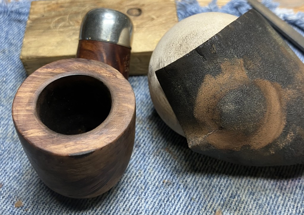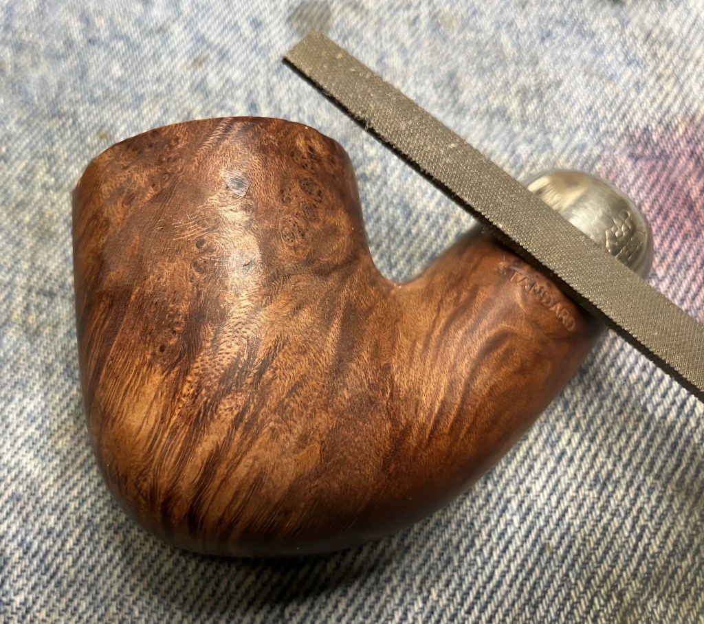 A 2 inch wooden sphere was used with a piece of 320 sandpaper to uniformly sand the inner rim.  This does add a slight bevel to the rim which was not a feature of the original pipe.