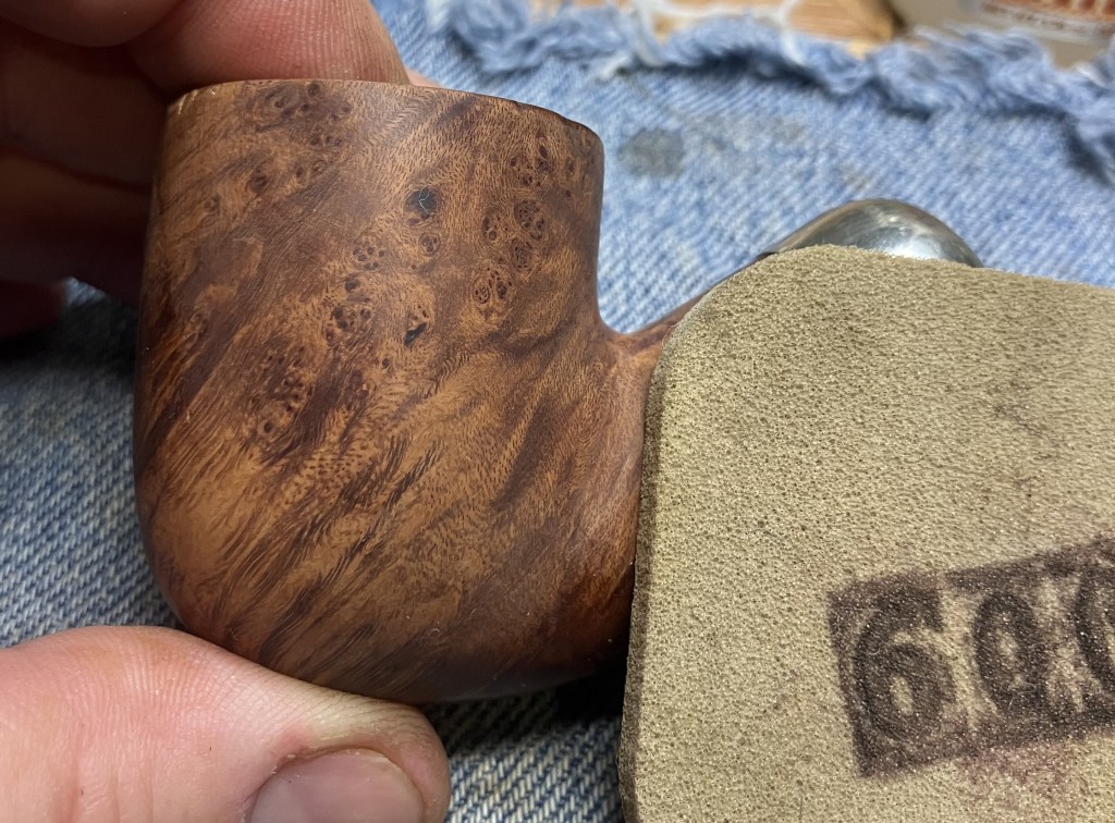 The sanding resumed with a series of sanding sponges from 320-3500 grit.  Between each sponge the stummel was wiped with an alcohol wetted make-up pad to remove sanding debris.
