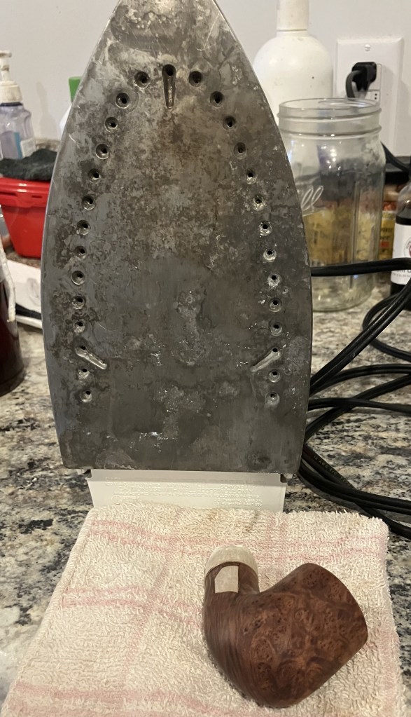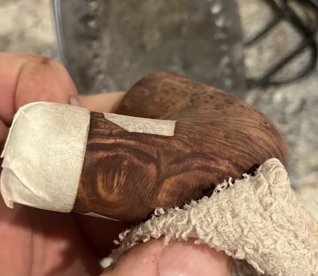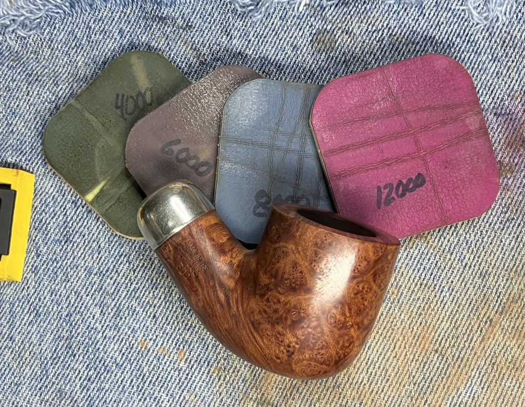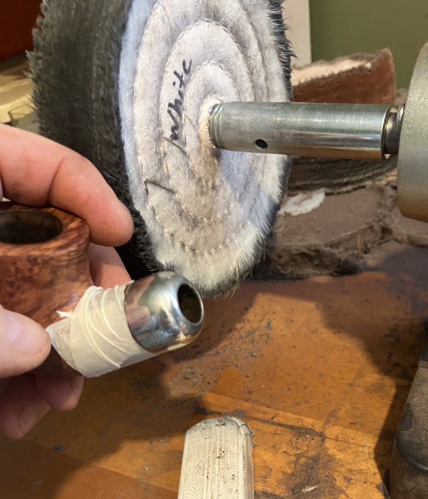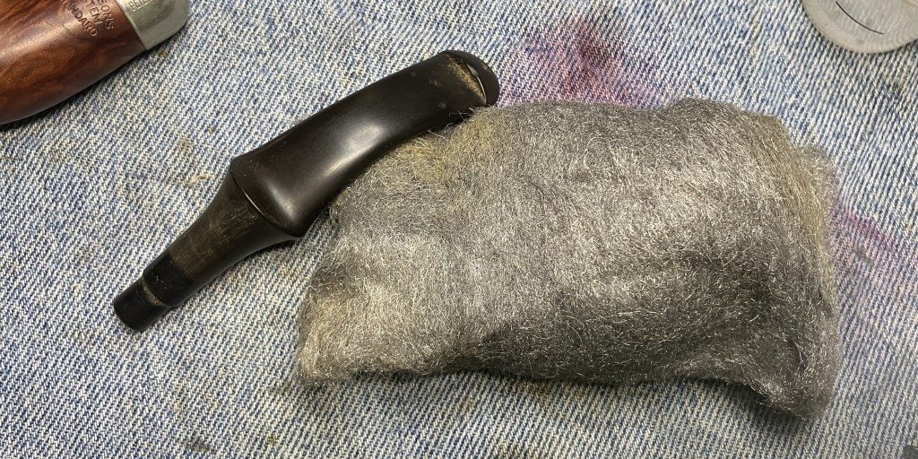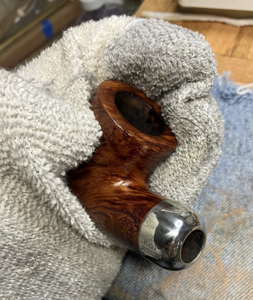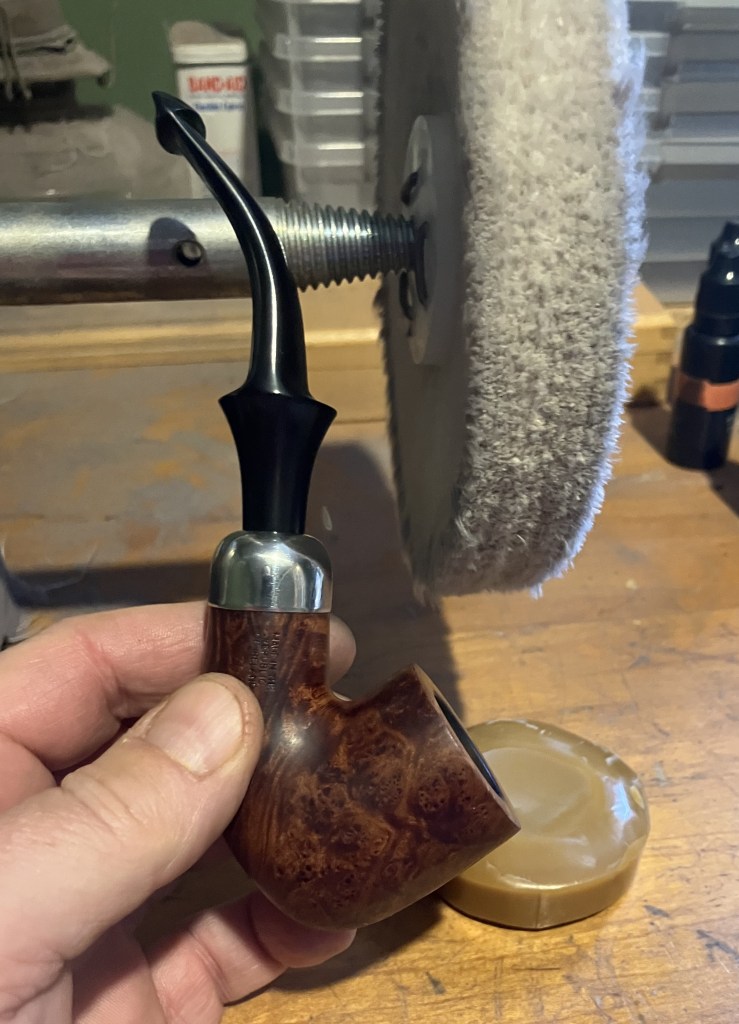 With the stummel finished and the stem buffed to a beautiful gloss, I coated both with several layers of carnauba wax at the buffer.