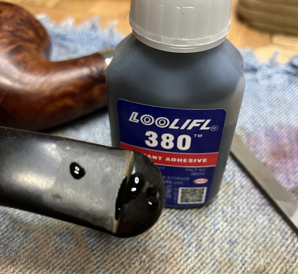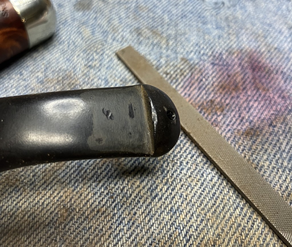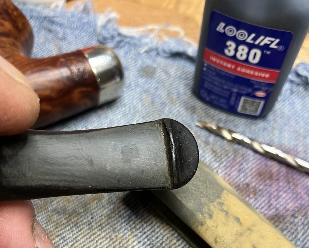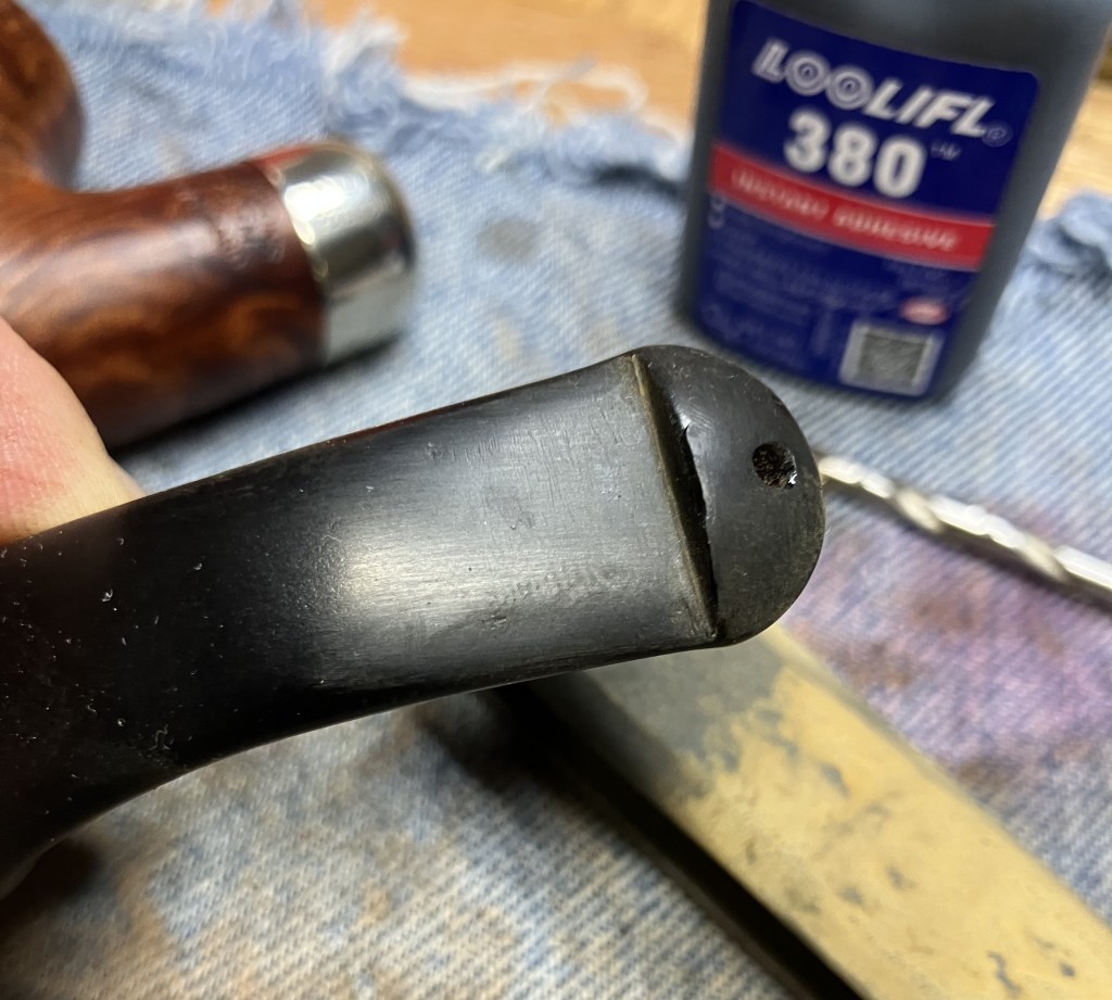 The bite zone of the stem was filed with a small flat file to reestablish the button’s edges and reduce the dents from Chompy, the previous owner.