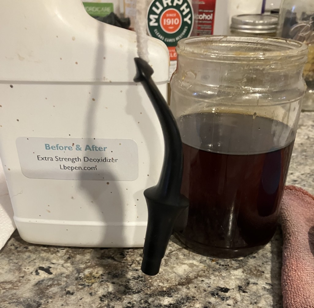 The stem was suspended in Before and After Extra Strength Deoxidizer (deox) by inserting a pipe cleaner into the button and hanging it in the solution.  I figured that 6-8 hours would be plenty of time for this stem.
