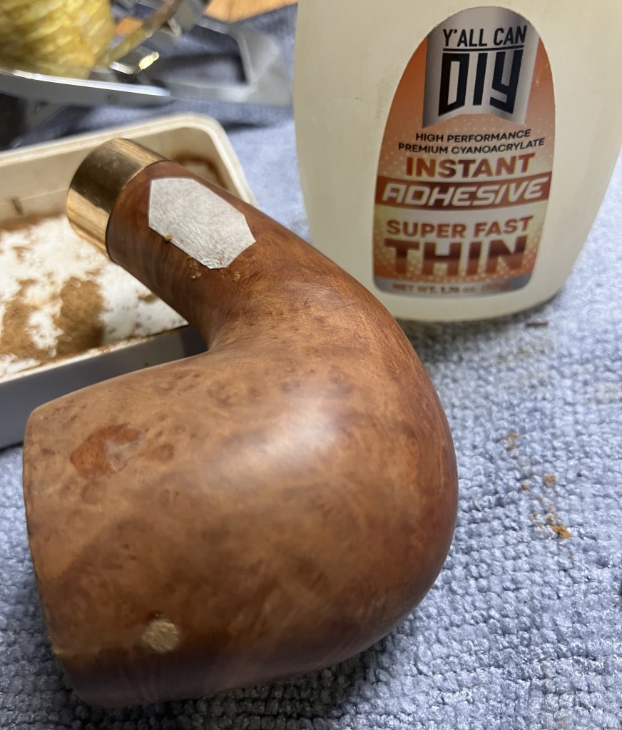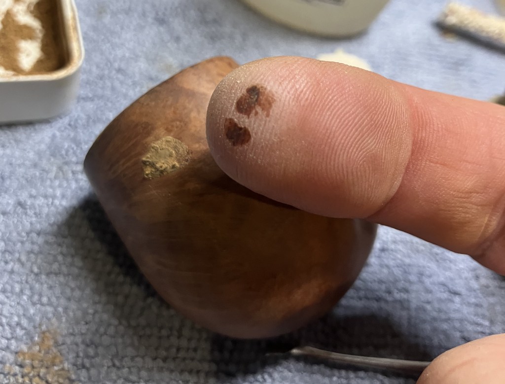 The old fills were picked out and new fill material was added.  I used a small drop of thin cyanoacrylate (CA, super glue) in the fill then pressed briar dust onto the wet CA.
