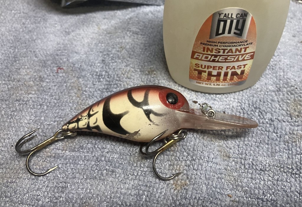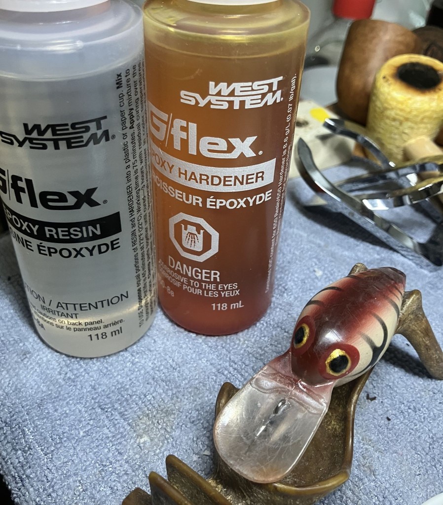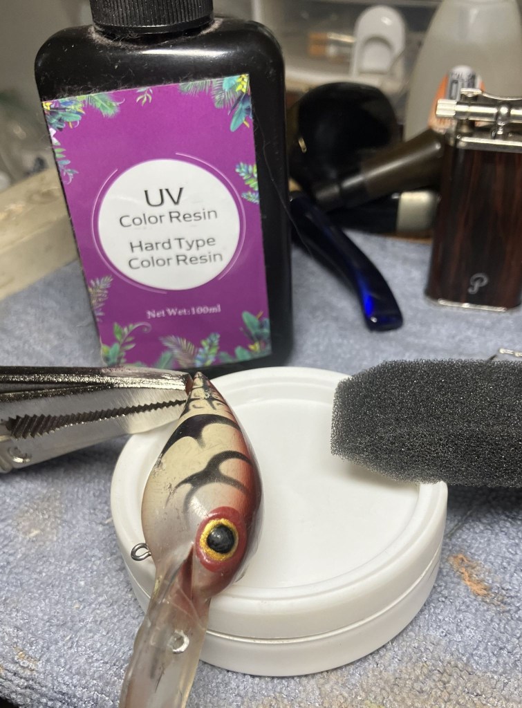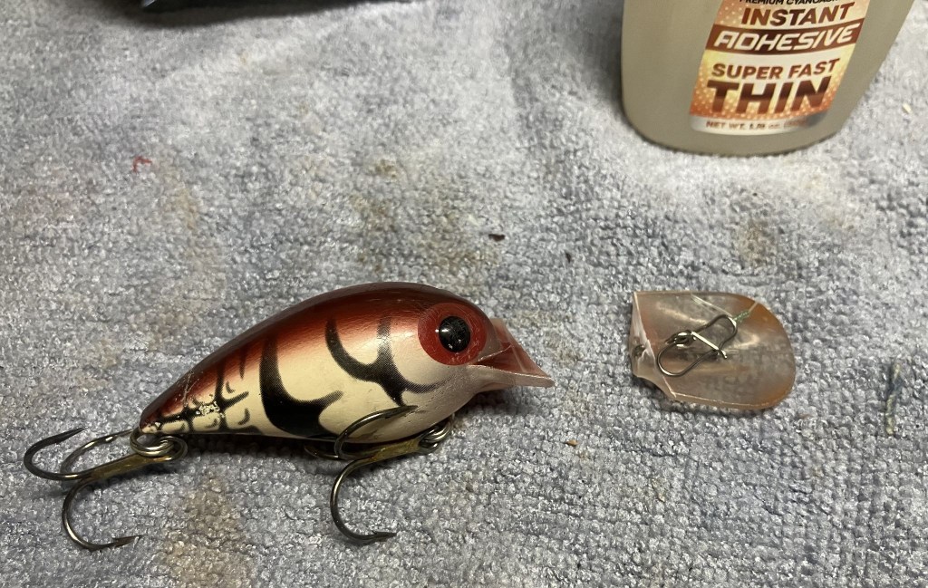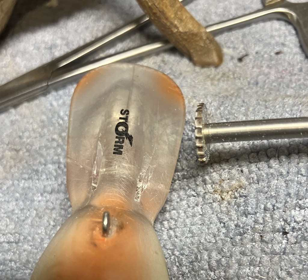 Not a pipe indeed.  If you have read my blogs for a while you may have picked up on one of my other vices, fishing.  A buddy of mine, let’s call him Matt, had (still has but I’m trying for grammatical correctness) a beloved Storm crank bait.  As you may have noticed from the above photo it suffered a catastrophic break.  When I saw the pieces on the deck of Matt’s bass boat I immediately felt his pain.  You know that little devil that pops up whispering nerdowell things in your ear?  Mine was saying, “Hah, he’ll never catch more fish than you with that lure again!”  Darn little devil.  After a morning of fishing Matt had once again caught more fish than me even without the use of his beloved bait.  I looked at the pieces and thought, “I can fix this”.  Matt said to give it a try, it was getting any better laying on the deck of his boat but at the same time, I couldn’t help but notice that it had not gotten picked up and thrown away.  Perhaps some things are just too painful to disregard.  That brings us to the blog for this week.  How can a pipe restorer repair a broken plastic lip of a crank bait?