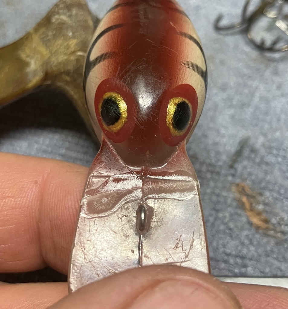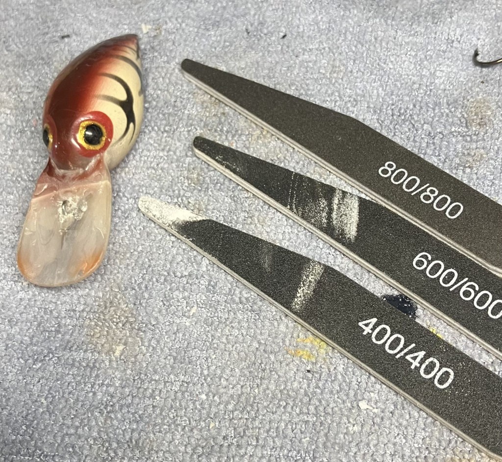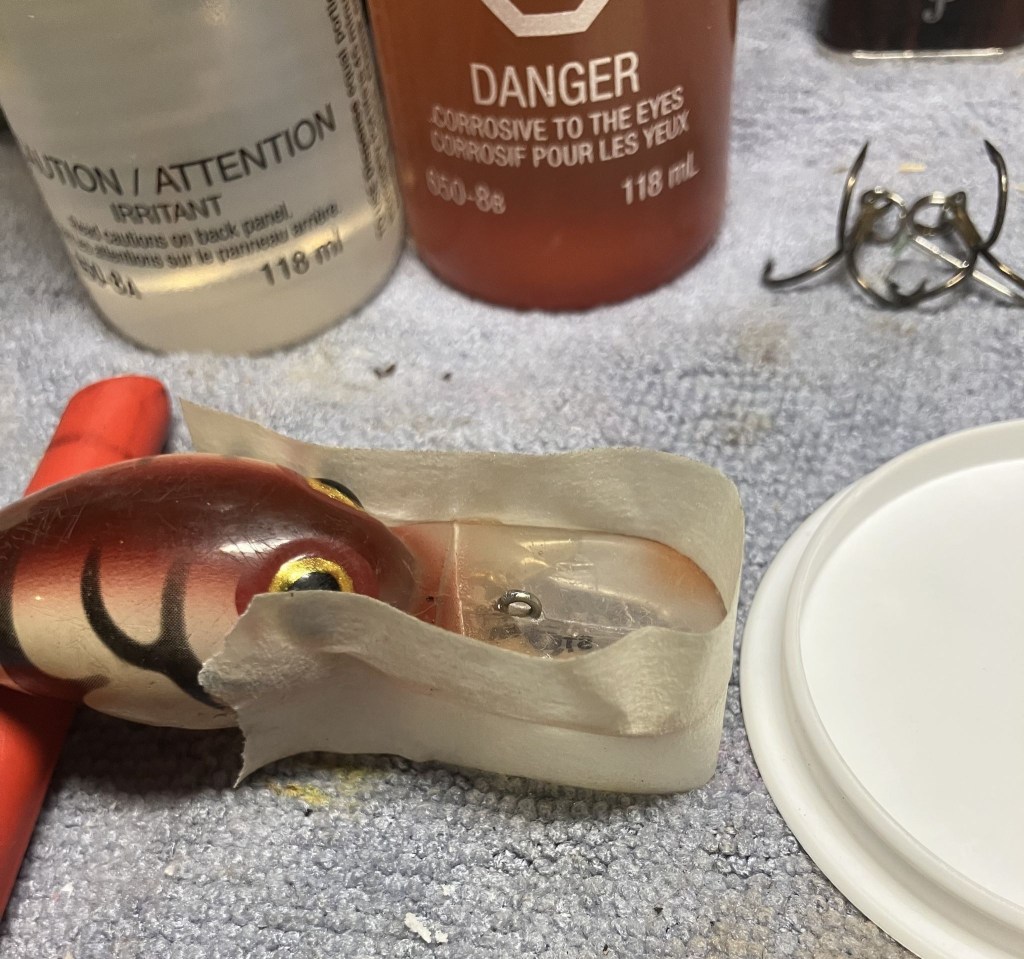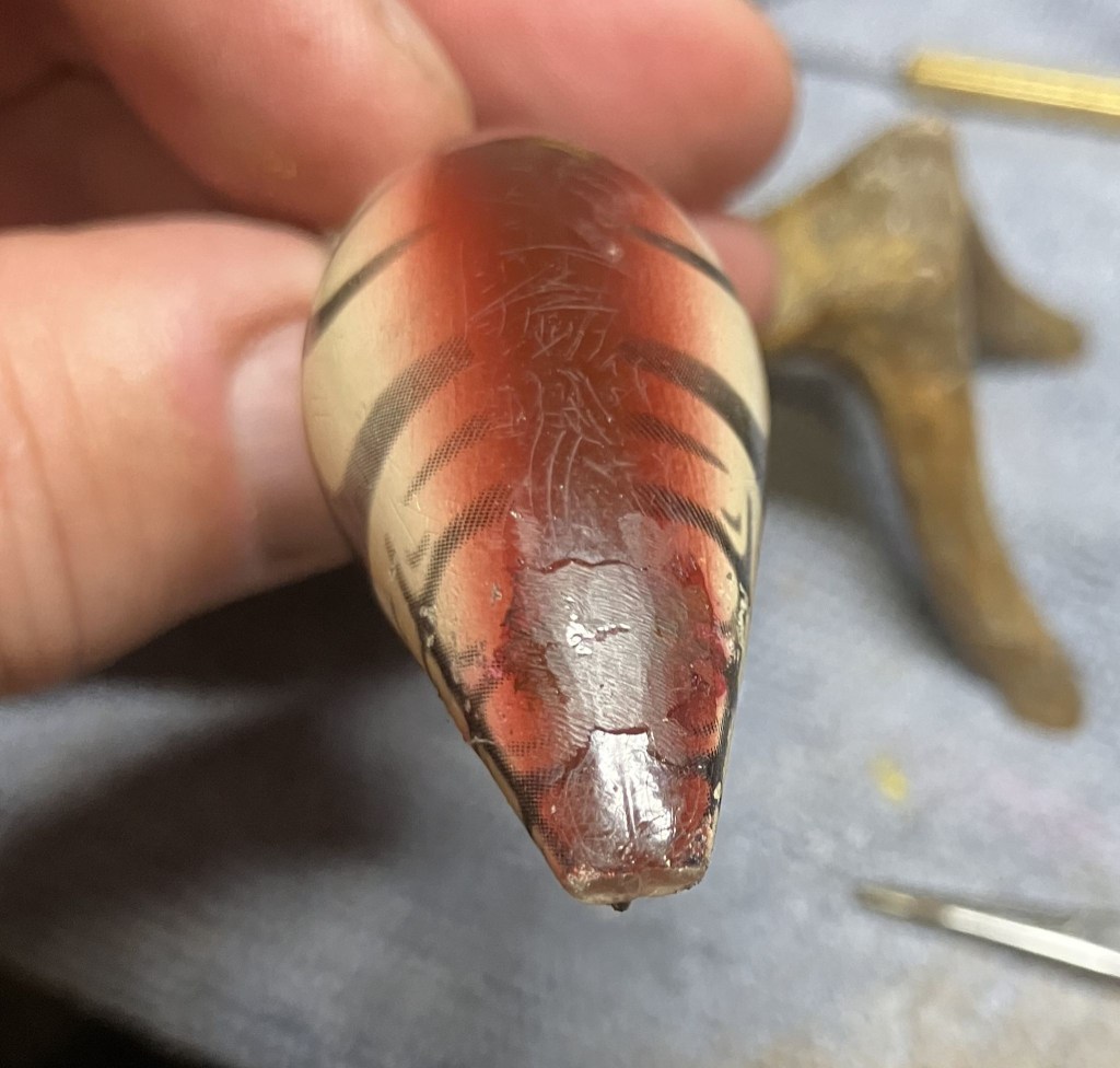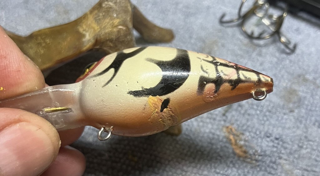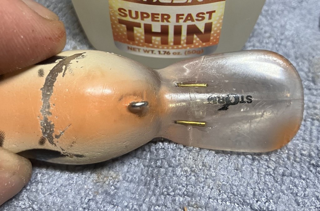 While allowing the glue to cure, I thought I should attempt to repair the “hook rash” or wear on the finish of the bait caused by frequent run-ins with the hooks.  That brown looked very similar to a mahogany wood stain.