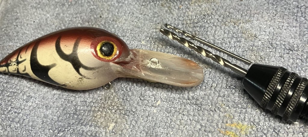 My first thought was to tack the lip back together with some cyanoacrylate (CA, super glue).  Not as a permanent repair but to get the lip back into its original position and alignment.  I also thought about completely removing the line tie and redrilling a new hole through the old line tie and into the molded resin body of the lure, then fashioning a new line tie and glueing it into position.  I judged that might significantly weaken the lip and would likely affect the movement of the lure through the water, so opted against that.