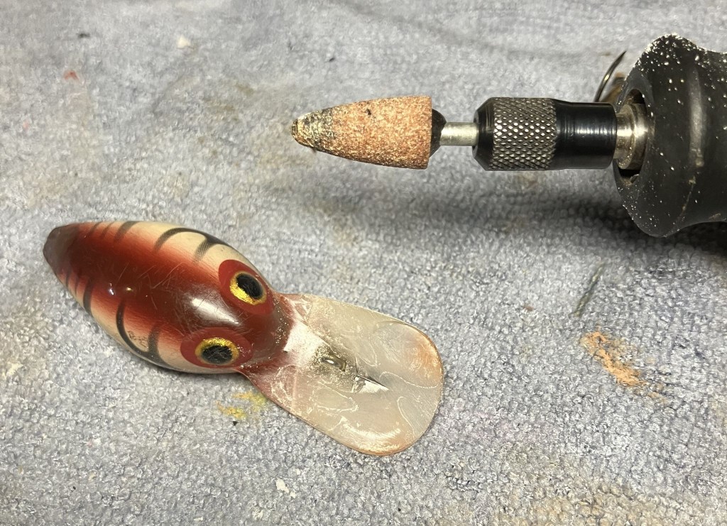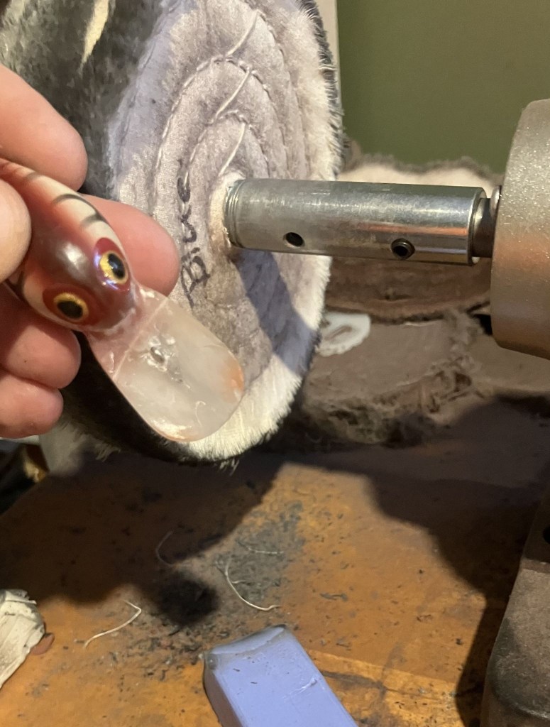 Once the epoxy was shaped to my satisfaction I buffed the bait with Blue Diamond compound on the buffing wheel.  This is where protecting the new paint would have really been a good idea.  The buffing kind of removed most of my beautiful color matching.  DOH!