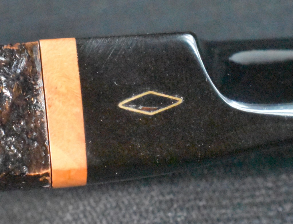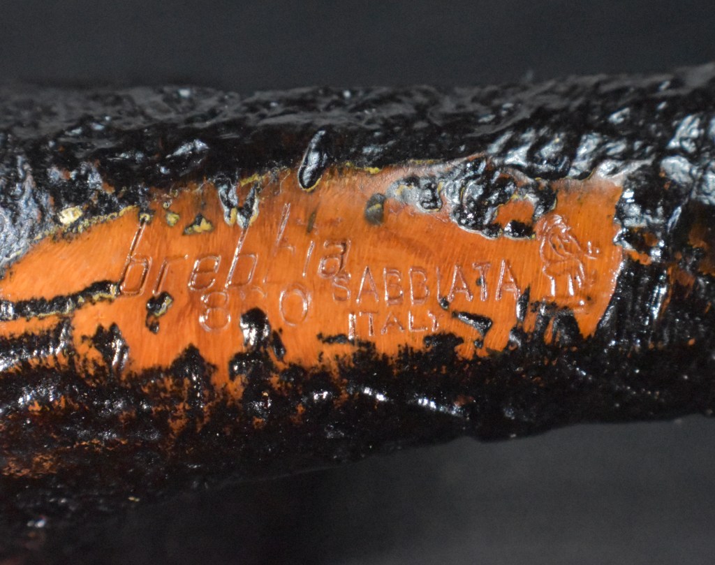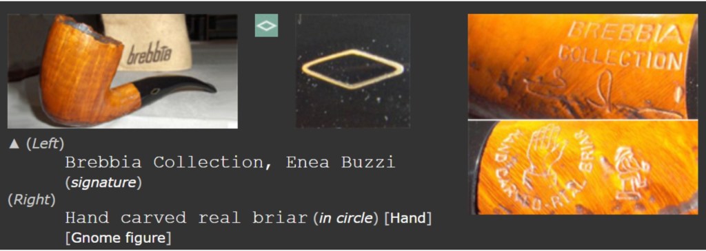 Additional reading about Brebbia can be found at Brebbia – Pipedia. As for the Brebbia logos, Brebbia — Pipes : Logos & Markings has a nice selection of photos including this one showing both the stem logo and the “Golden Gnome” as on the Brebbia in hand: