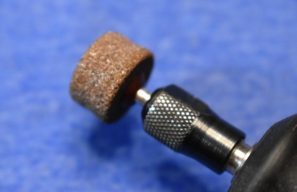 Next was sanding to address the tooth chatter and rebuilding the button. I wrapped 400 wet dry sandpaper around a small foam block to give it additional stiffness. I then sanded the area beyond the button to rid the stem of the dents from clenching. The dents were shallow so after a bit of sanding I tried to paint them with a light in hopes of raising them. This worked a little but I didn’t need much. Happy with the dent eradication I wrapped a piece of scotch tape up against the edge of the button. This would provide a straight edge for filing the black cyanoacrylate (CA, super glue). I applied a bead of glue along the top of the button. I quickly inverted it so the CA would be hanging down. I adjusted the drip by rotating the stem until it looked like it was filling the depression. I then spritzed the CA with an accelerant to speed the curing. I then used a flat needle file to reshape the button. I had to repeat the application of CA a few times to build-up material where I wanted it and file it off to regain the shape of a proper button. Once satisfied with the shape I used 400 sandpaper to smooth and polish the rough edges. One of these days I will actually remember to photograph this process rather than getting caught up in the moment.
