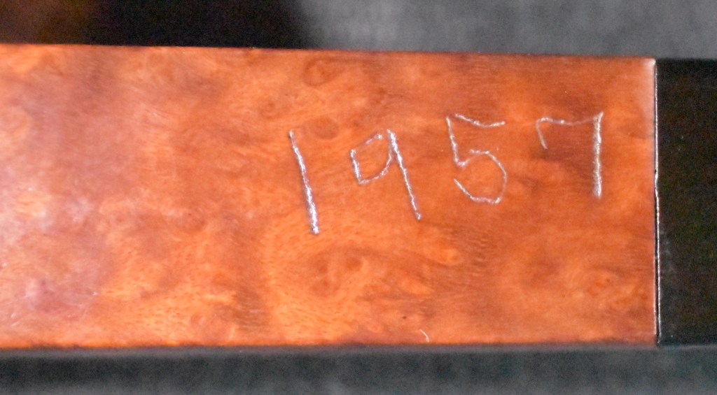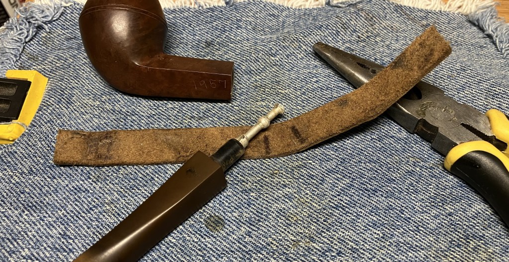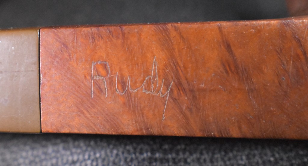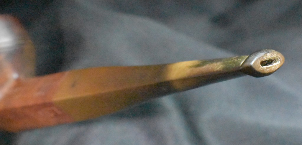 Back in October, 2025 Dal Stanton published a restoration blog about a Kaywoodie Tuck away that he did New Life for a Rare, Early 1960s Kaywoodie ‘Tuckaway’ Standard 050B – The Pipe Steward. This well researched and written post does a fine job at documenting the Kaywoodie Tuckaway far better than I have done. Dal’s pipe also has the “filter-free see-through bits” alluded to in the Collector’s Guide quoted above. This forces the question of when did Kaywoodie produce the three examples which I have come across? Well the only thing which I state is the above quote, “The Tuckaways of the 1955-1968 period had military mountings” (Collector’s Guide to Kaywoodie Pipes – Pipedia). The bits associated with these three pipes are not exactly vulcanite, nor are they nylon. They are apparently some different plastics. They do not oxidize like vulcanite but they are softer than acrylic. They dent from tooth chatter more like nylon but they are easier to sand file and sand than the nylon bits of Medico or Falcon pipes. The white clover logo does show a yellowing with age which was refreshed to the white with sanding.