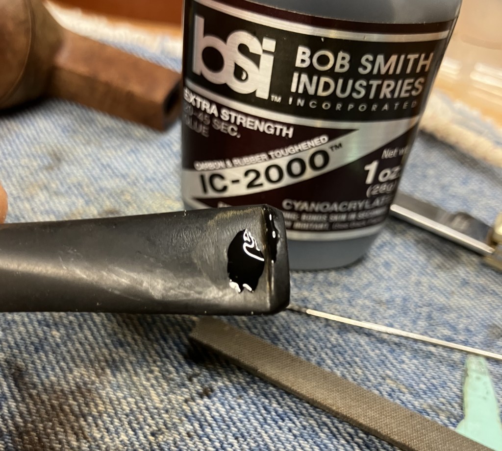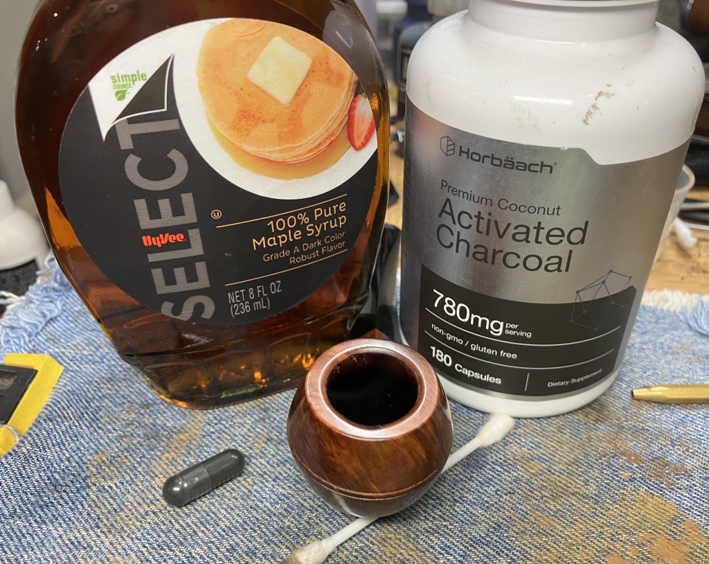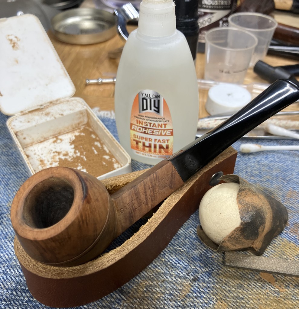 The pits were filled with briar dust which was pressed into the pit. The dust then received a small drop of thin cyanoacrylate (CA, super glue). The CA was absorbed into the briar dust and bonded the dust to the stummel nearly instantly.