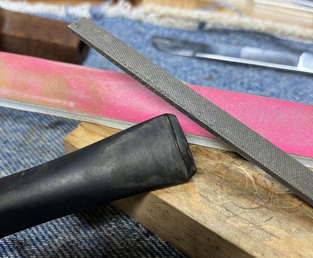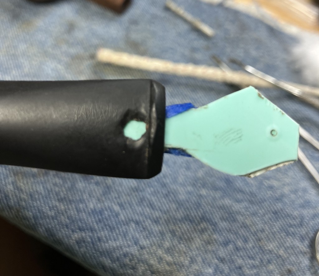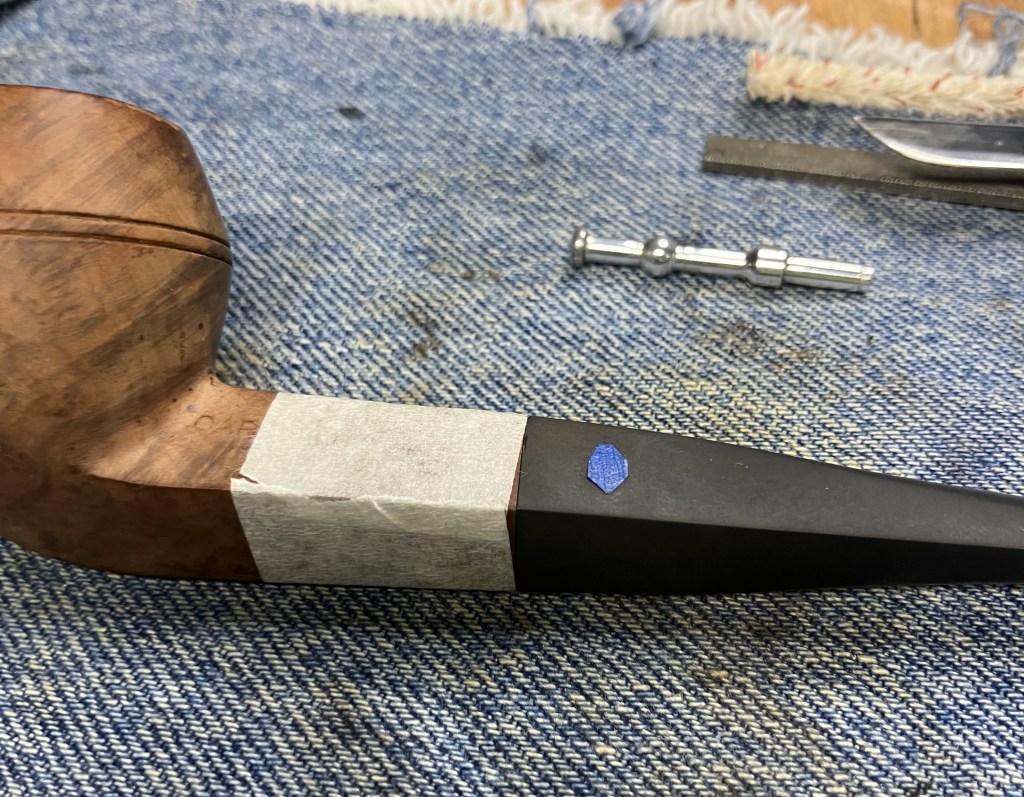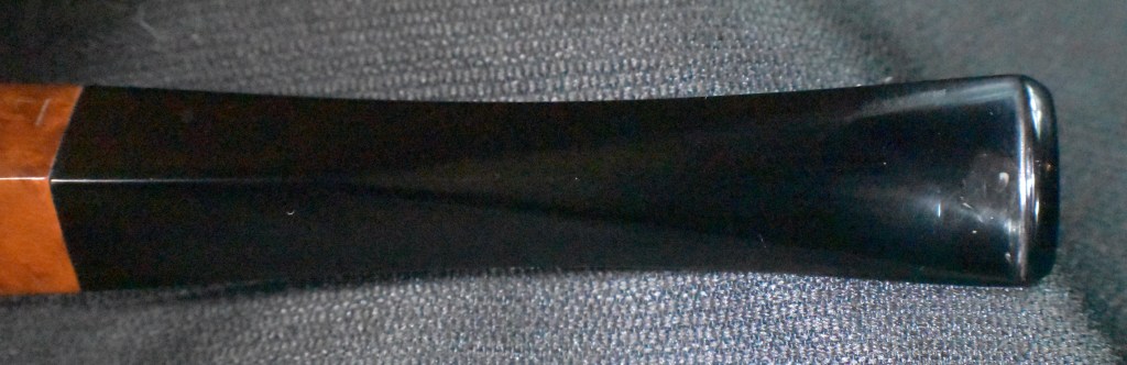 The stem was sanded with a series of sanding sponges from 400-3500 grit. The masking tape remained on the collar for this sanding. Between sponges the stem was rubbed with mineral oil and wiped with a paper towel. This wiping was to remove any sanding debris. Once the sanding was finished the masking tape was removed and the stem oiled with Before and After Hard Rubber Balm.