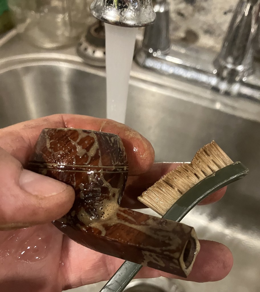 The stummel was returned to the sink for rinsing with copious amounts of water. To make sure the oxalic acid was completely rinsed and neutralized I scrubbed the stummel with Castile soap and a nylon brush. I figured that the basic nature of the soap would neutralize the remaining acid.