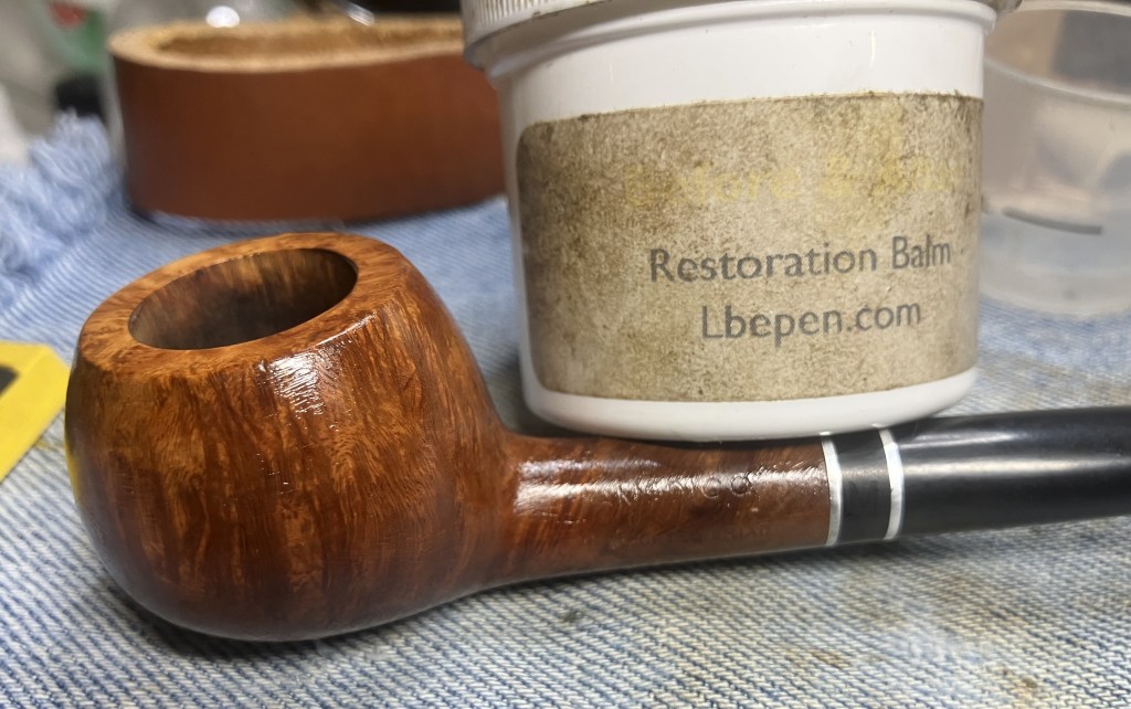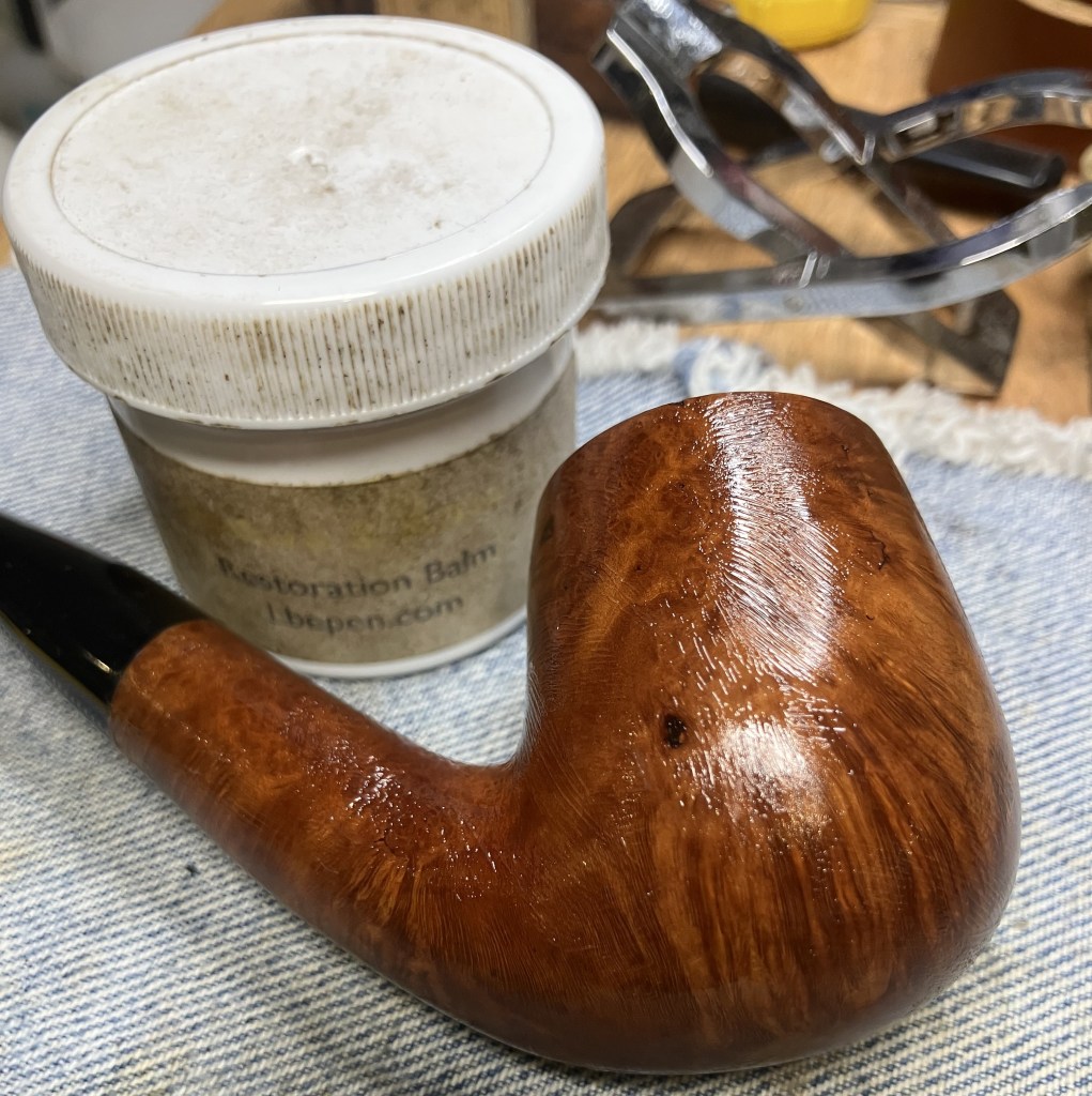 A thorough hand buffing of the stummel with an inside out athletic sock was used to remove the excess balm.