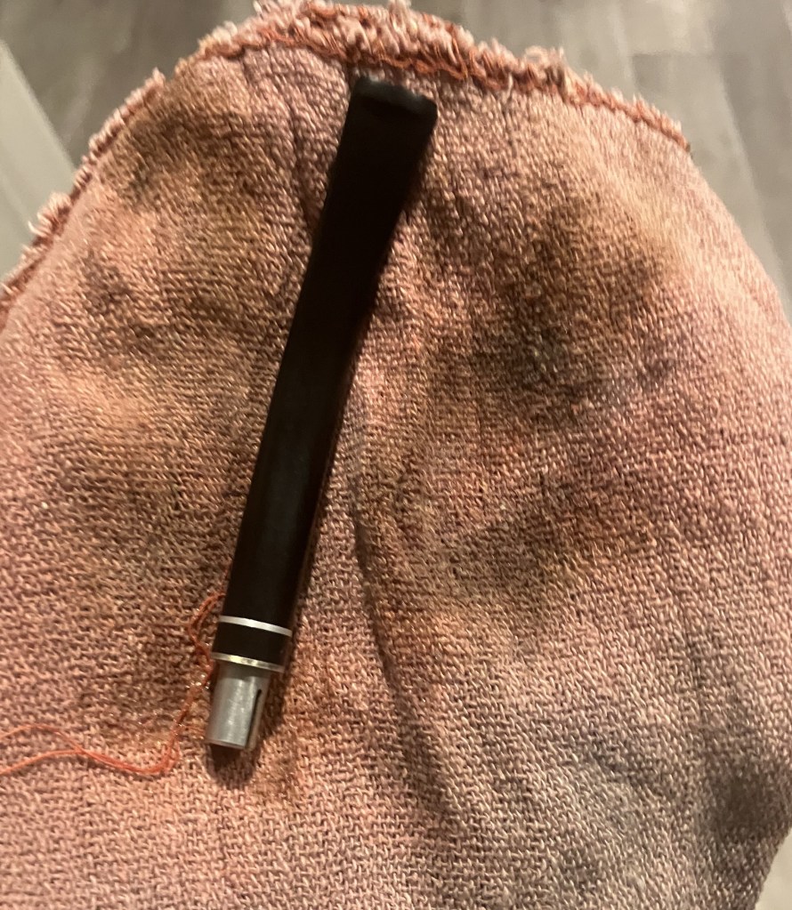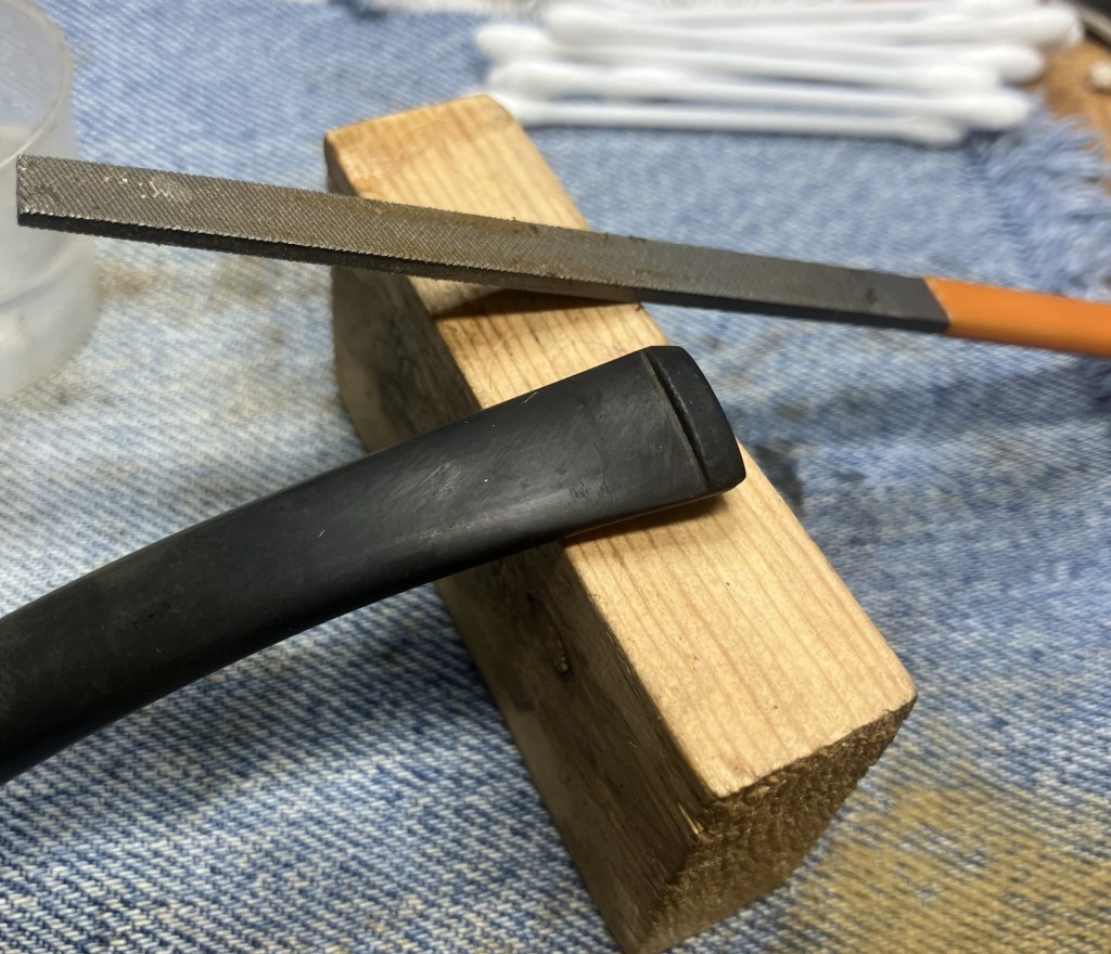 The stem was then sanded with 320-600 sanding sponges. There was also a little bit of filing of the tooth chatter, but I failed to photograph that. You can see the tip of the file in the photo below, though.