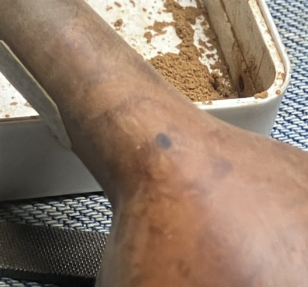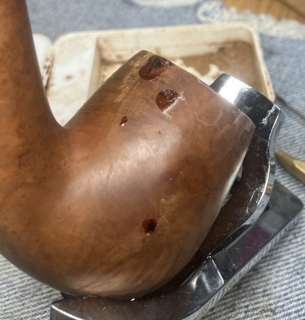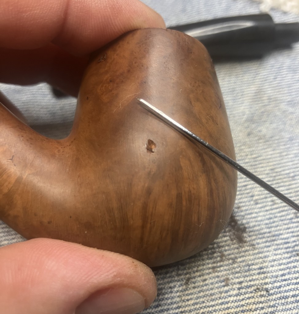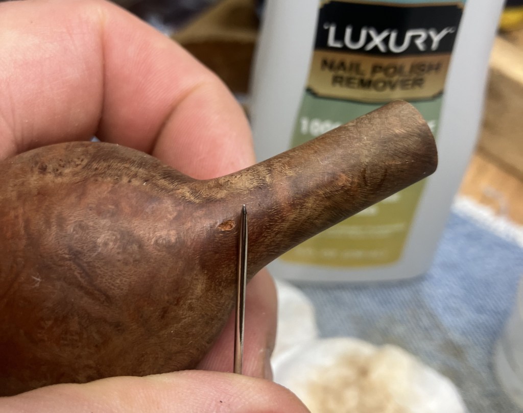 The larger pits were packed with briar dust by pressing the dust in with my finger tip or the curved back of the dental scraper..